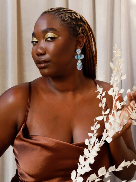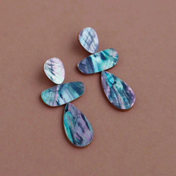 Stunning statement earrings made with wood and sea blue Mother of Pearl. The shapes on each earring are made individually which gives them flexibility and movement.