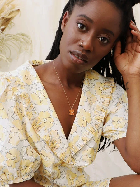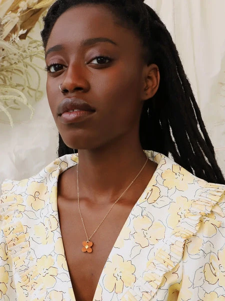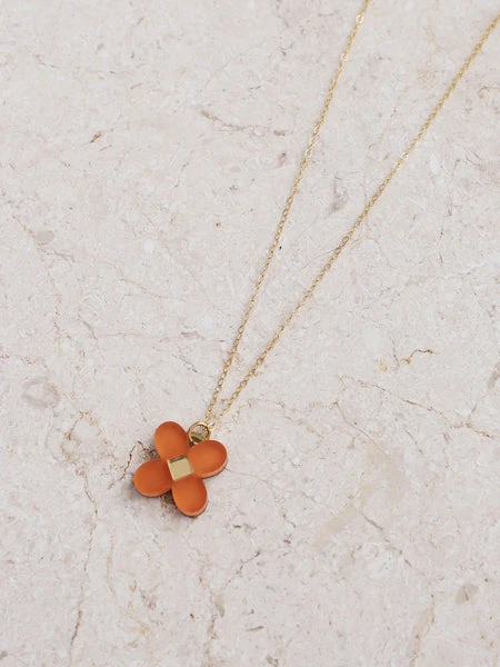 Inspired by of decorative ceramic tiles, the Bella Necklace is a delicate daisy pendant made using recycled ecru acrylic on a 14k gold-filled chain, perfect for everyday wear.