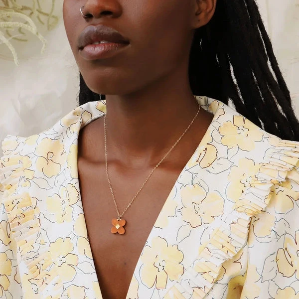 Inspired by decorative ceramic tiles, the Bella Necklace is a delicate daisy pendant made using recycled ecru acrylic on a 14k gold-filled chain, perfect for everyday wear.