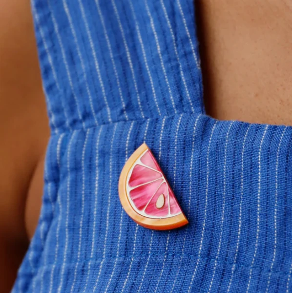 A vibrant grapefruit pin to squeeze some fun into your style.