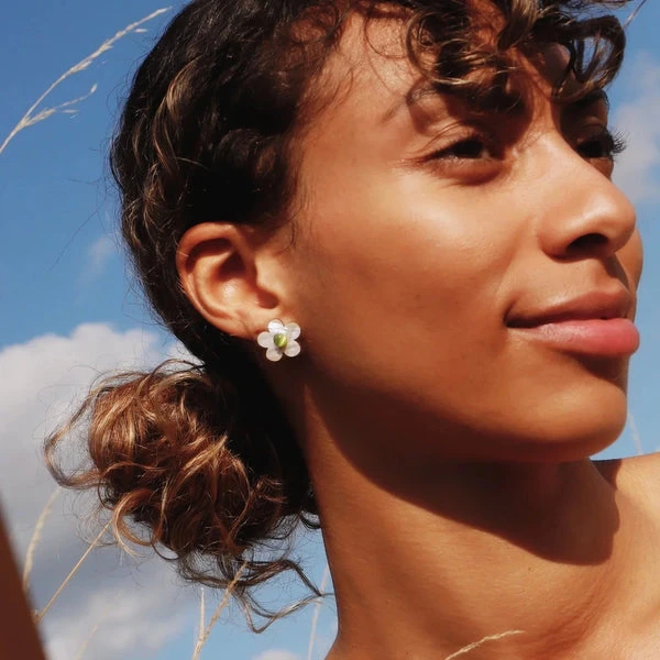 Elegant and playful stud earrings featuring a mother of pearl floral charm with olive Czech glass bead detail.