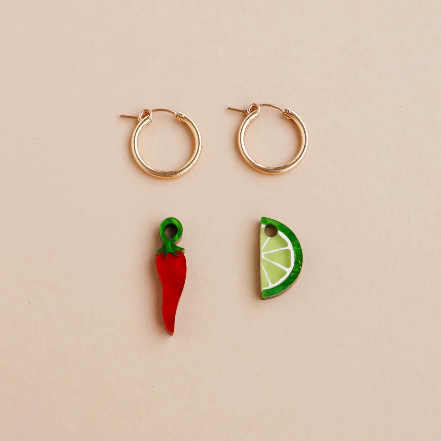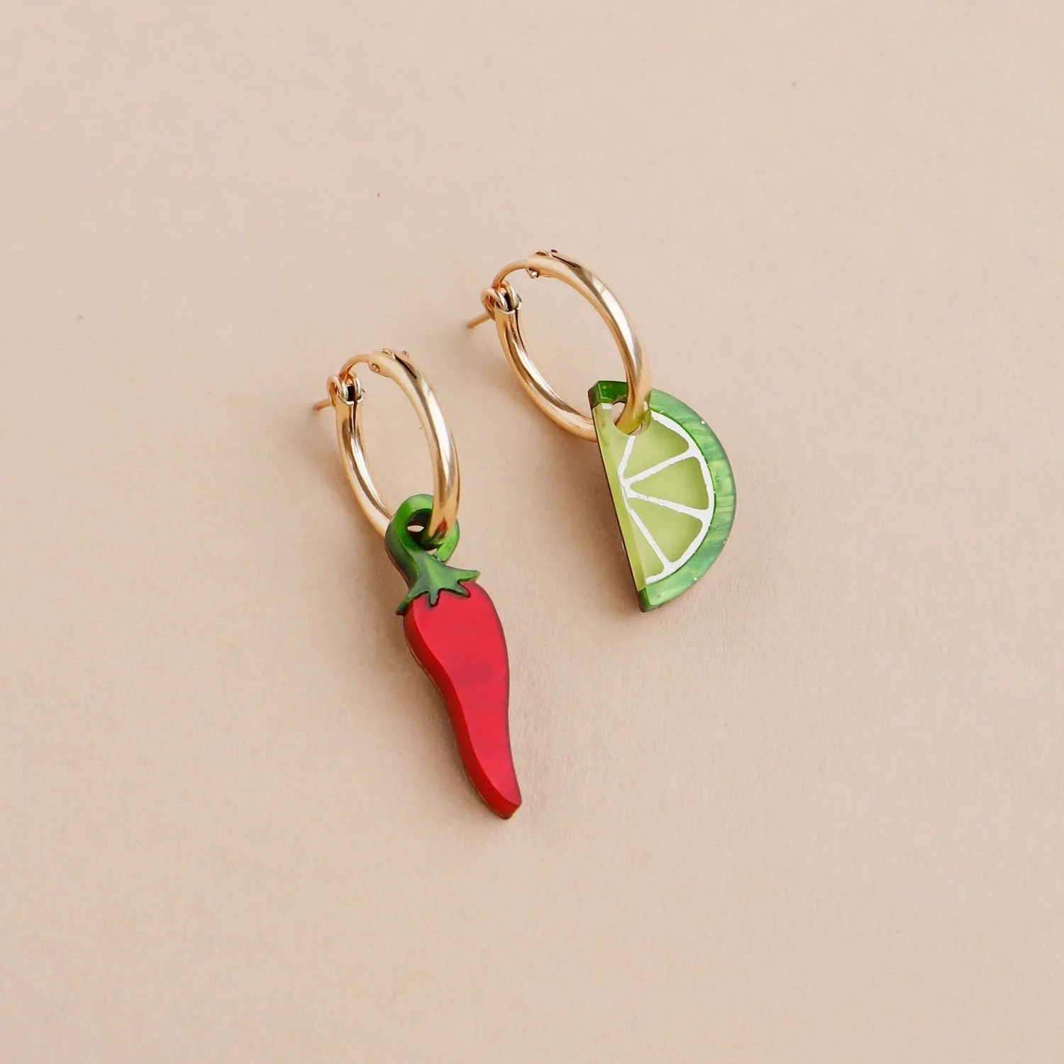 Dimensions: Chilli charm is approx. 2.9cm x 0.8cm. Lime charm 2.1cm x 1.2cm. Total earring weight for the chilli charm is 1.3g with hoops, 0.6g without hoops. Total earring weight for the lime charm is 1.2g with hoops, 0.6g without hoops.