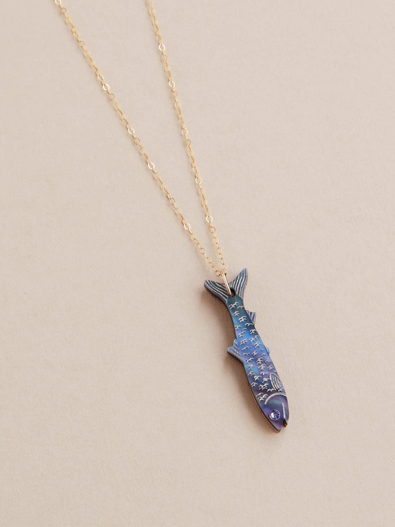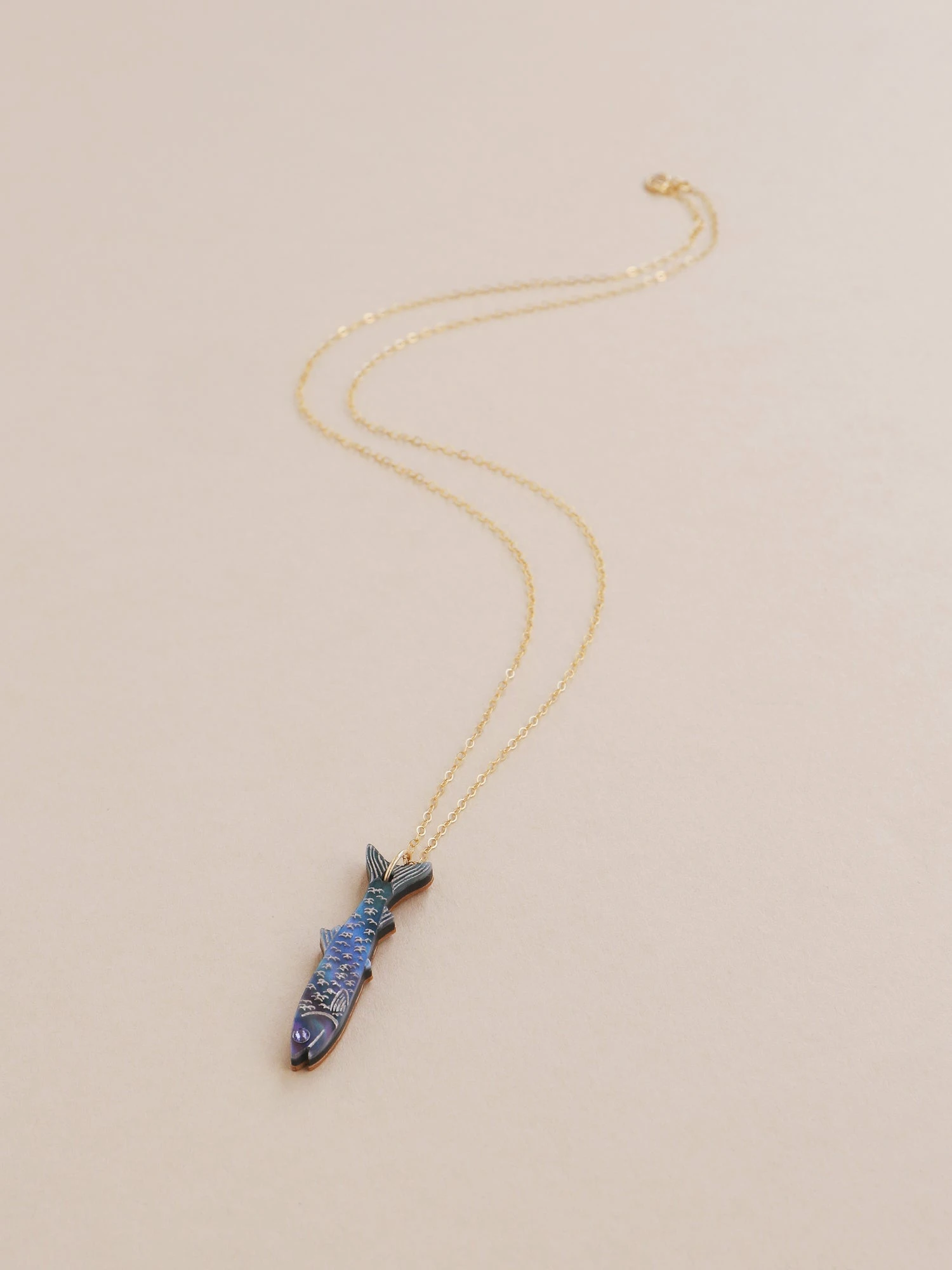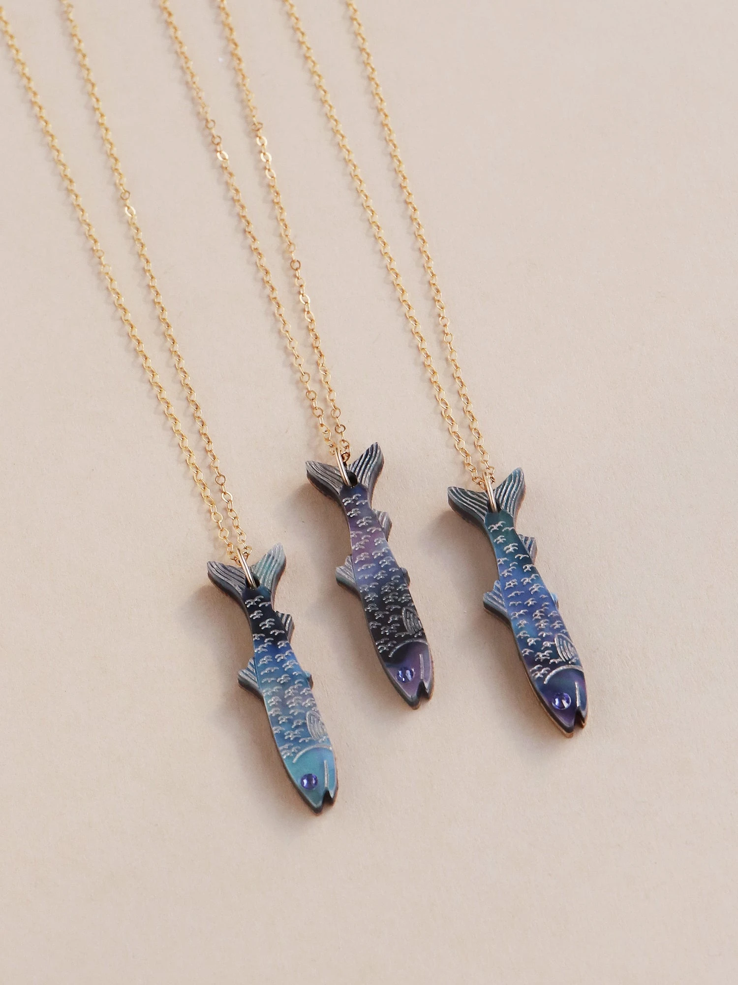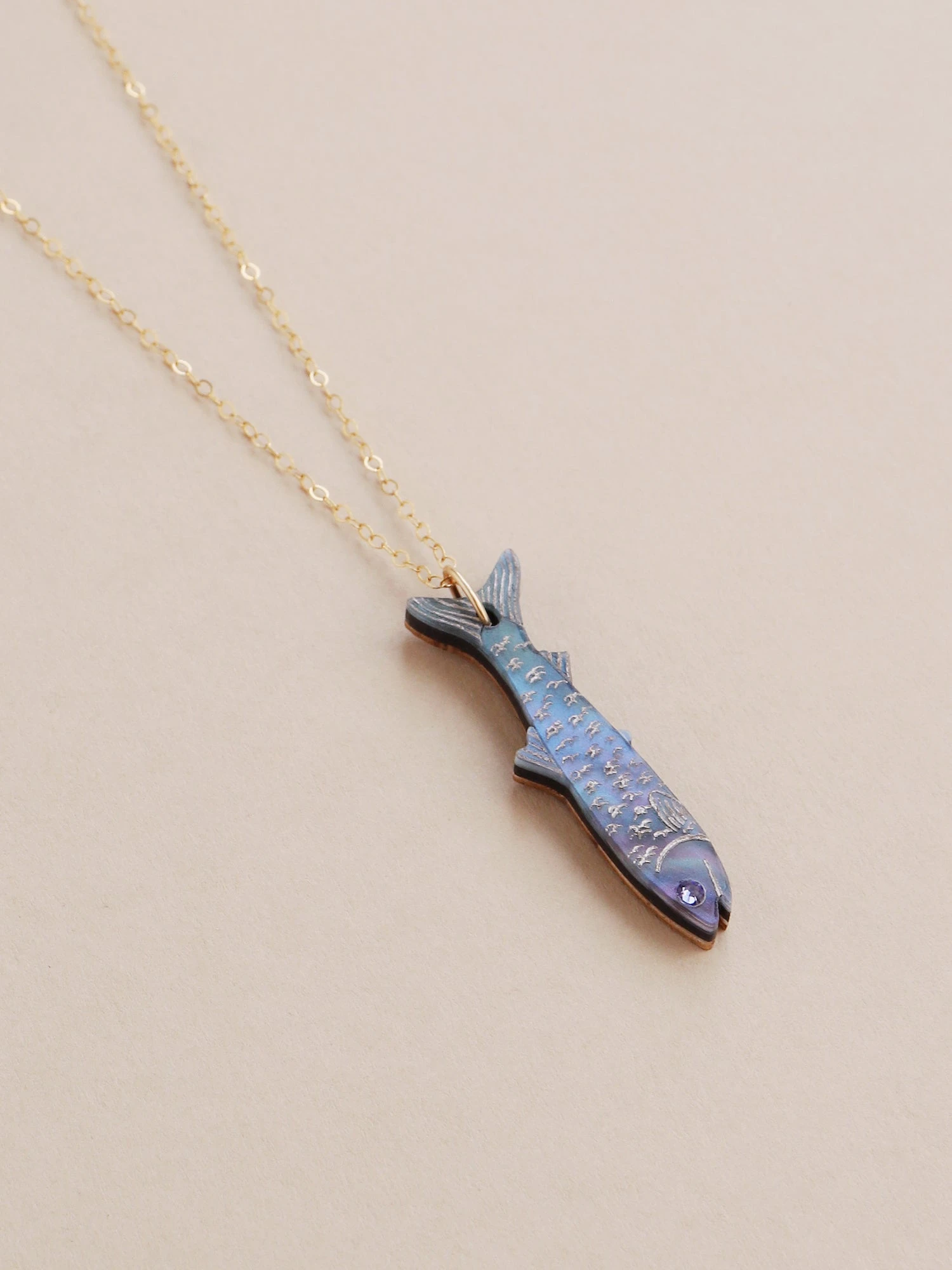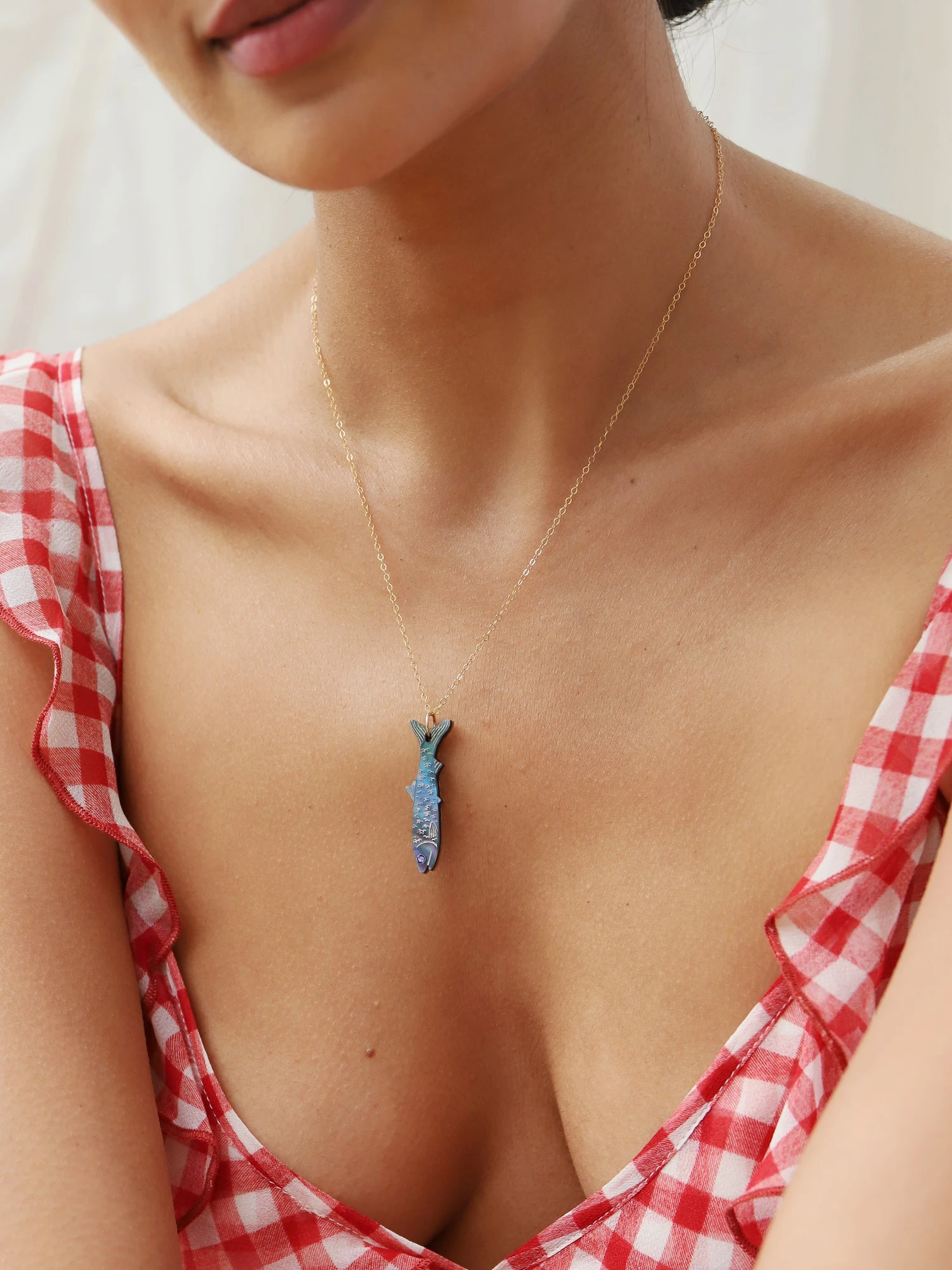 Get ready for a sunny day at the beach with our anchovy necklace! Our hand-crafted anchovy necklace is made with marbled acrylic and hand-inked details.Â