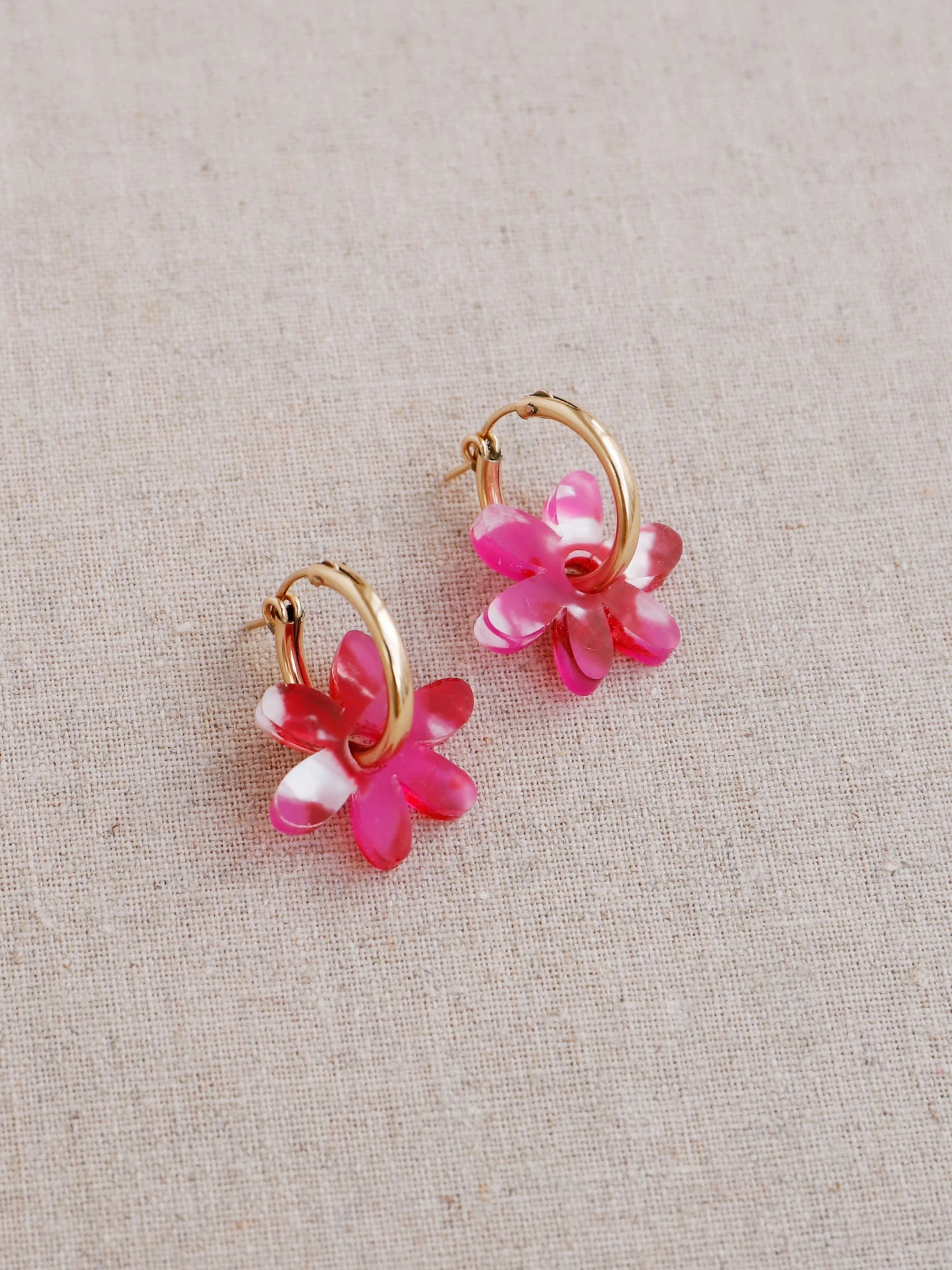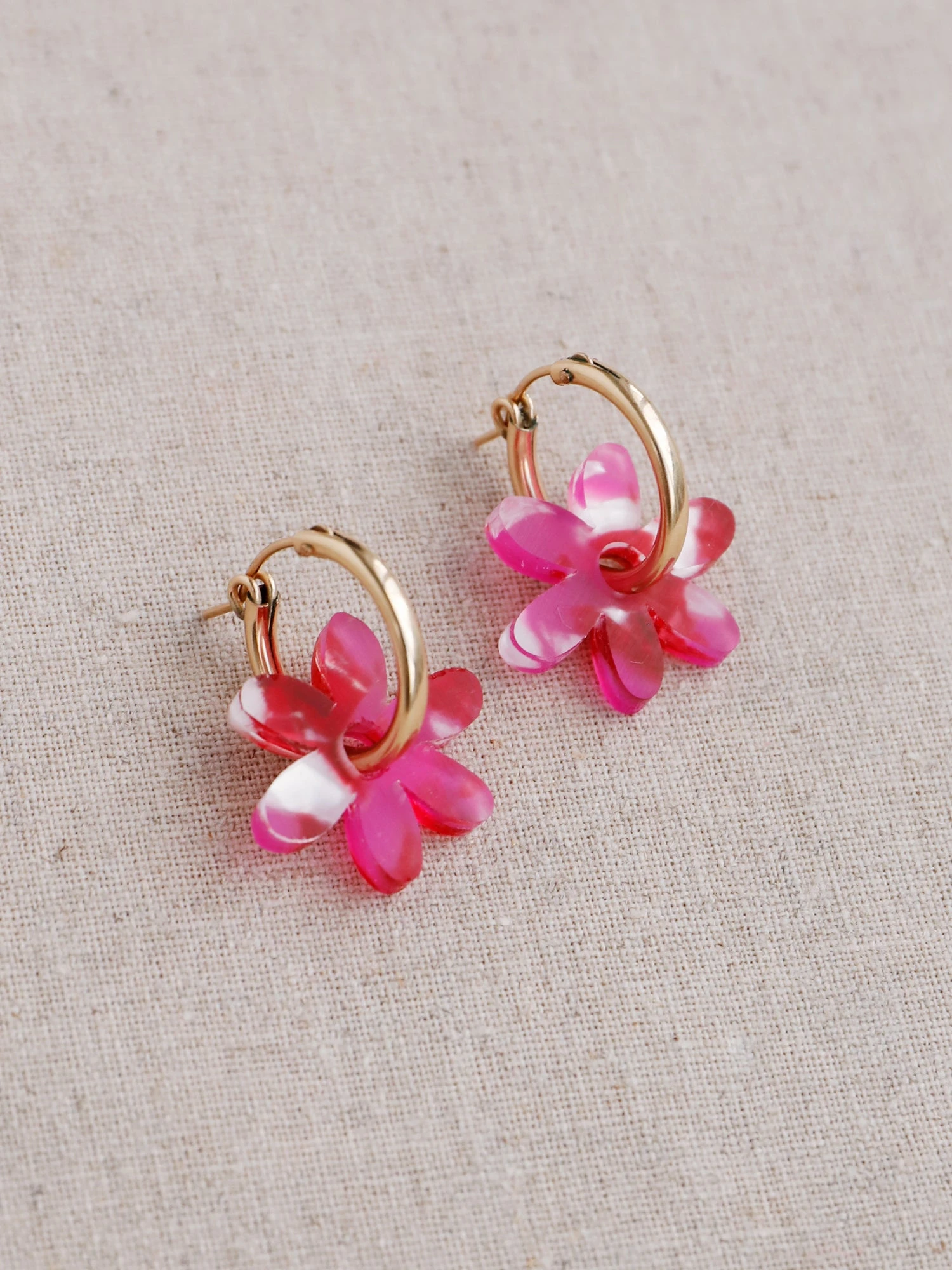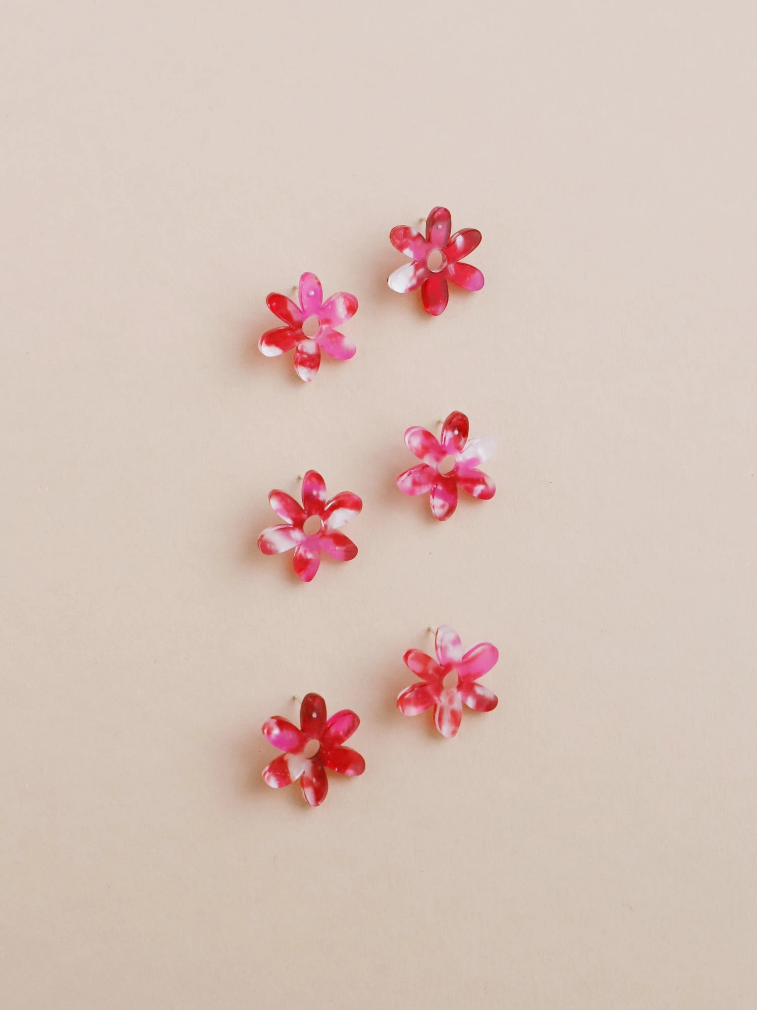 Small abstract flower charms made from 100% recycled acrylic.