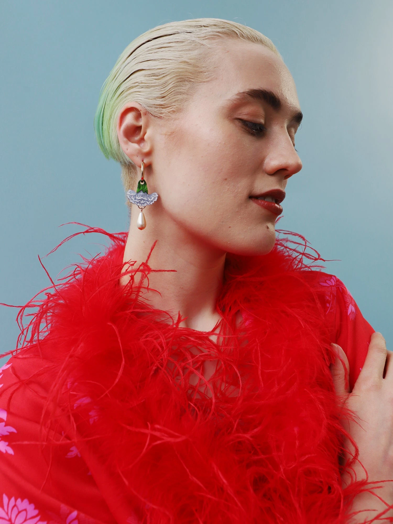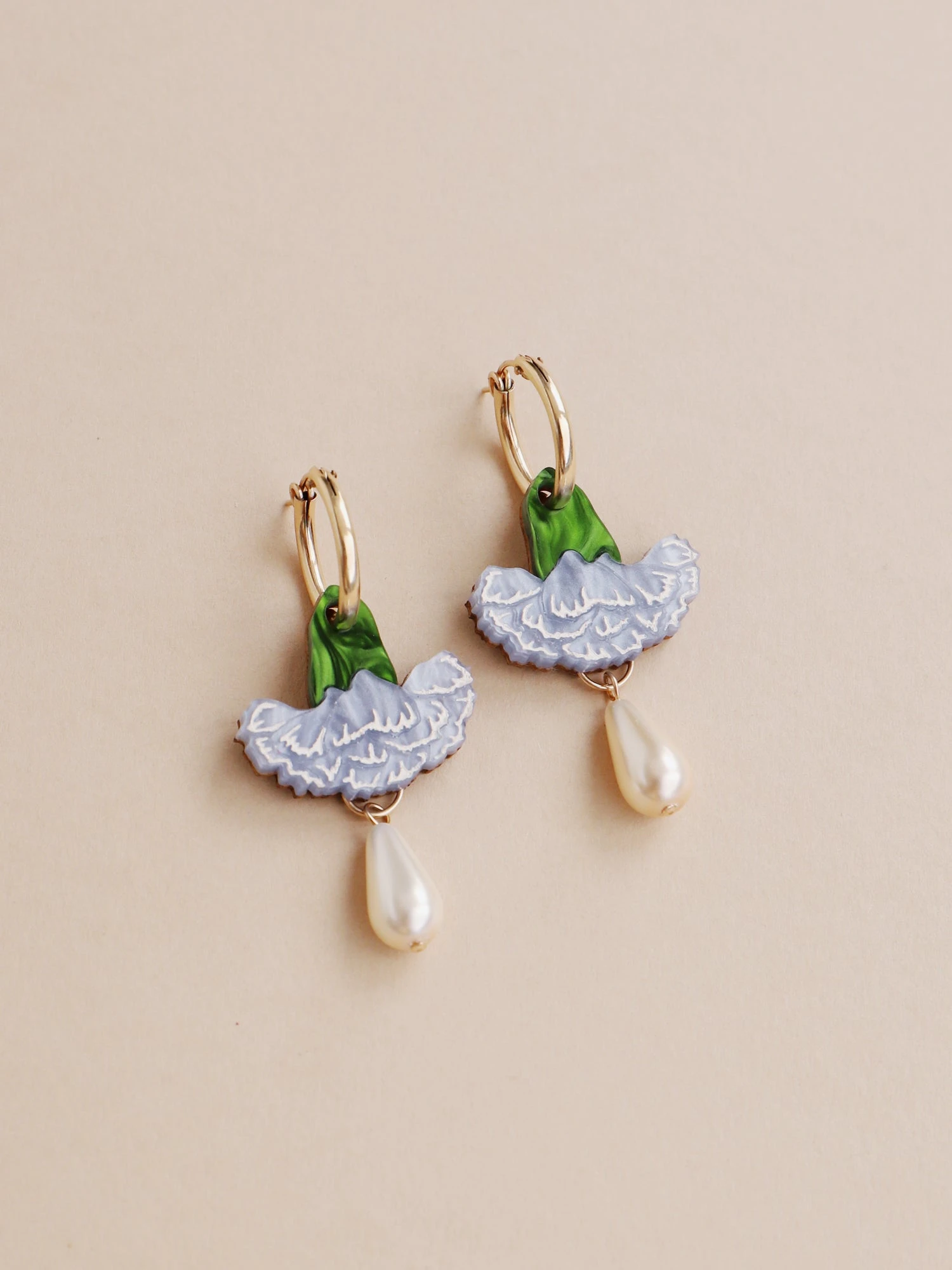 Step into a world of whimsy with our Carnation Drop Hoop earrings. These playful blooms are super lightweight, and are made from acrylic with glass pearl details and hand-inked engravings.
