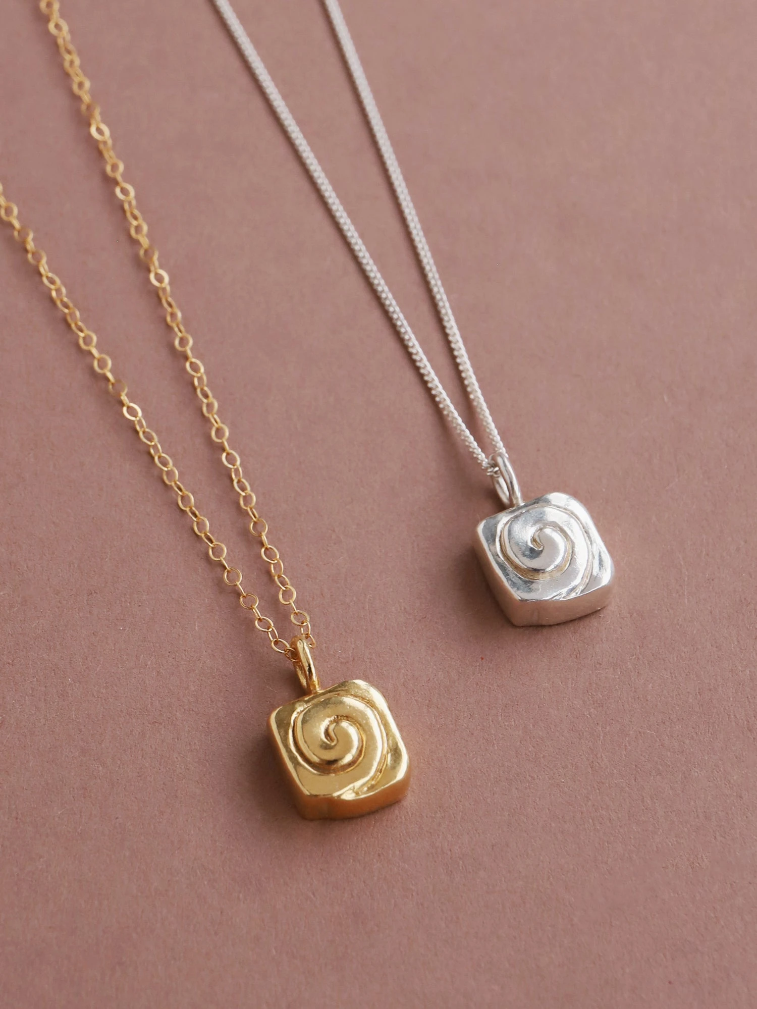 Hannah designed and hand-carved the cinnamon bun pendant initially in wax. Each piece is then cast from a mould into recycled sterling silver using the the ancient technique of lost wax casting.