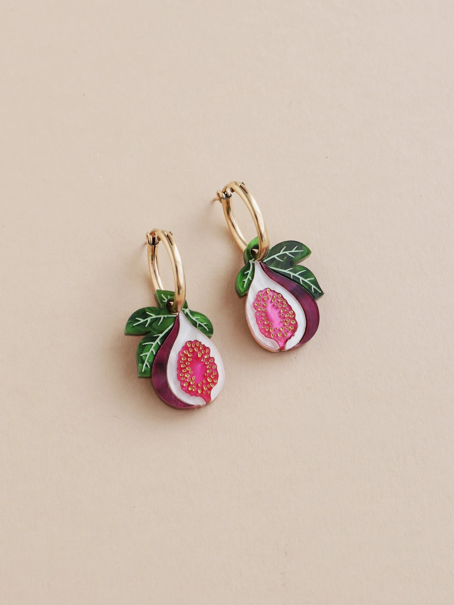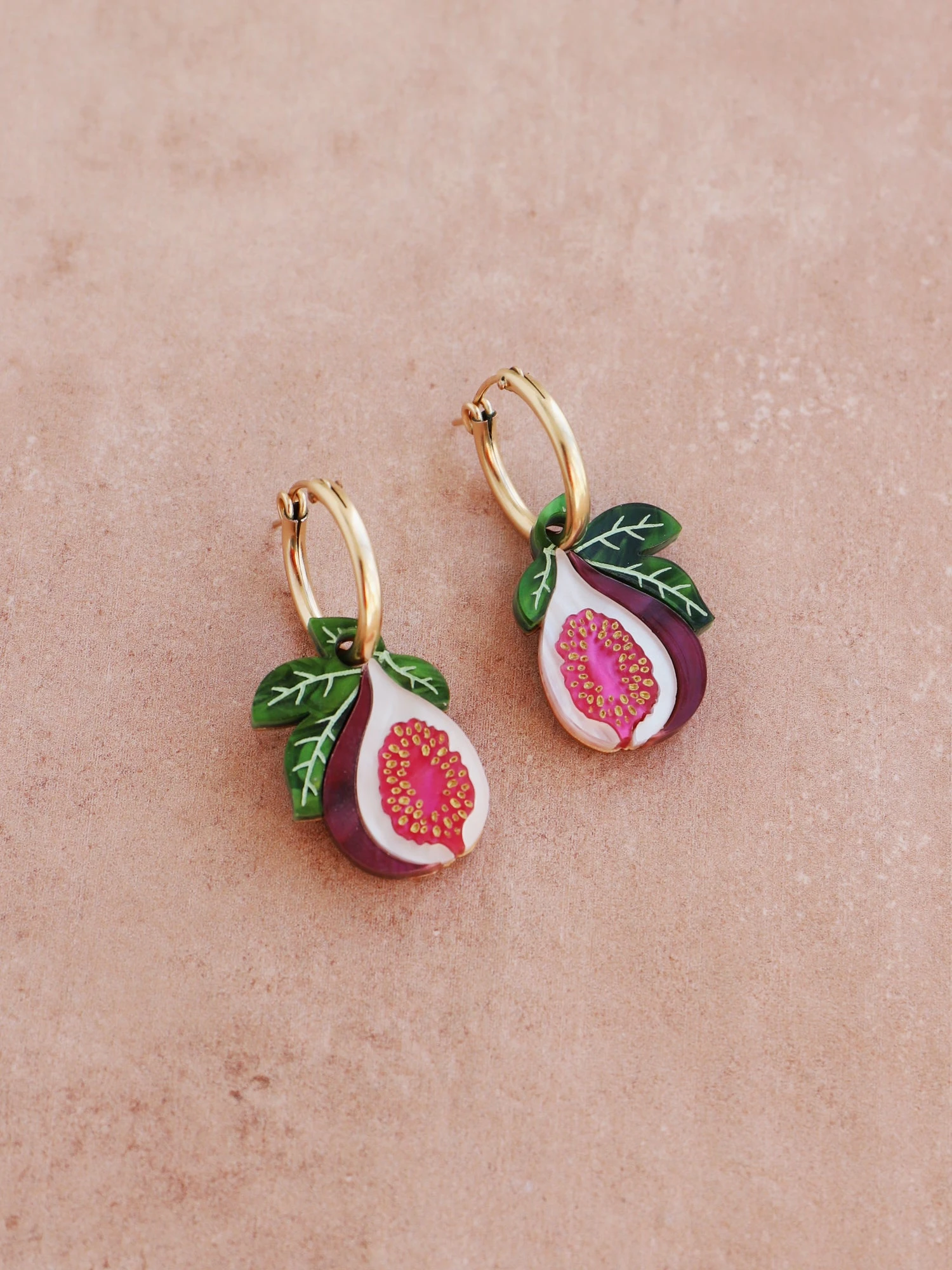 Delicious fig hoops, made from acrylic and wood with hand-inked details.Â