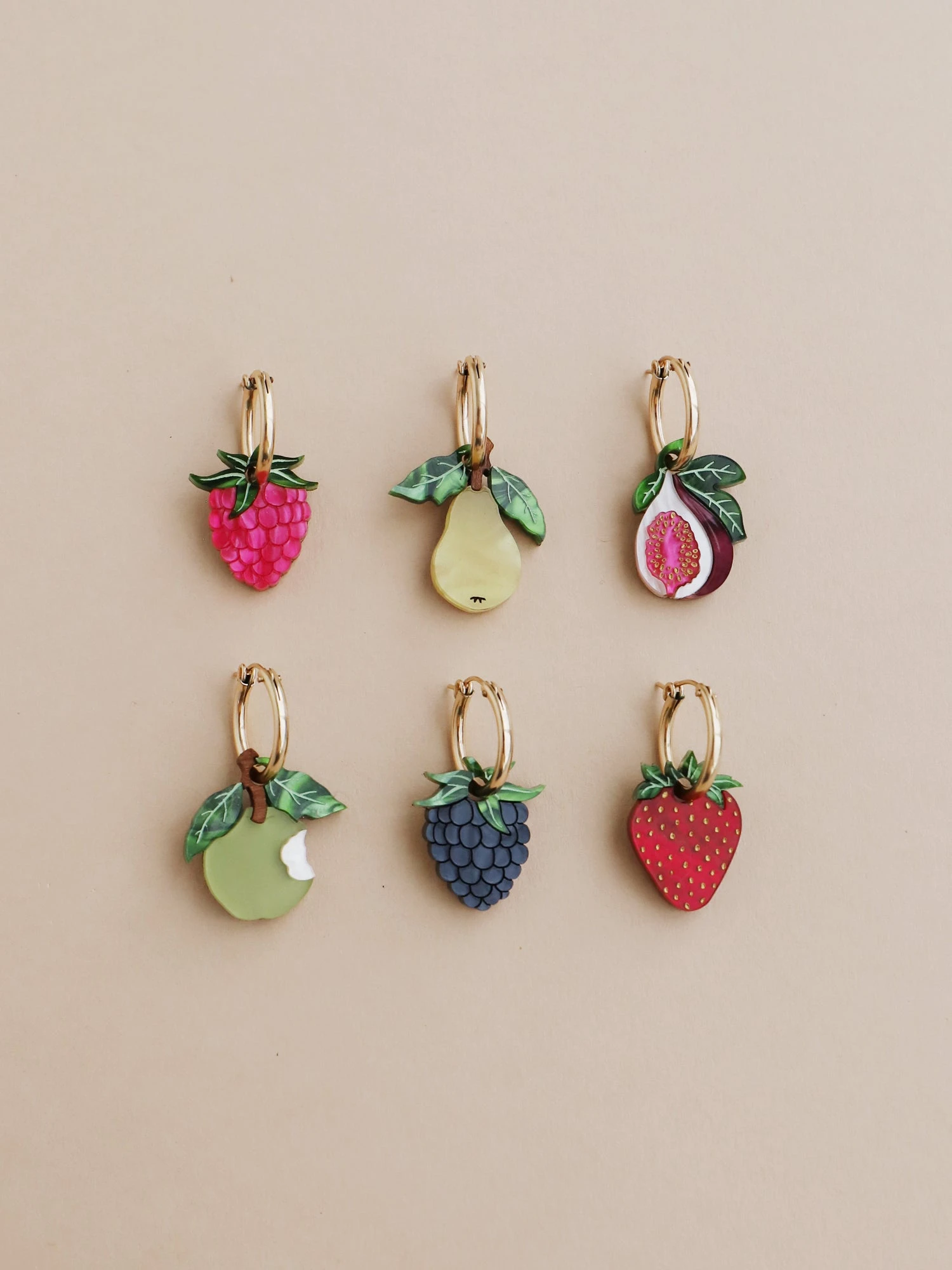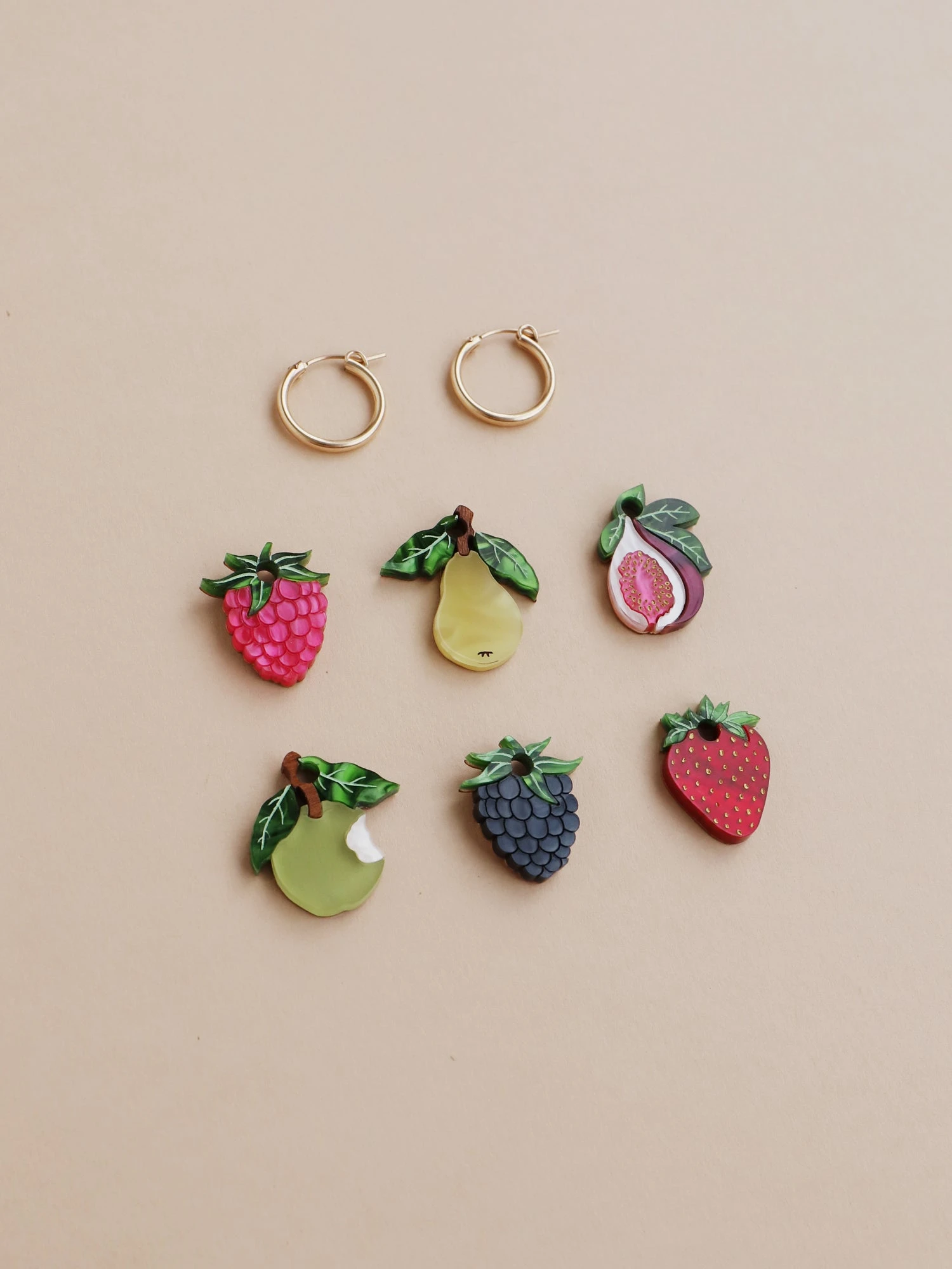 1x pear II charm, 1 x strawberry II charm, 1 x raspberry charm, 1 x blackberry charm, 1 x fig charm & 1 x apple charm.Â
