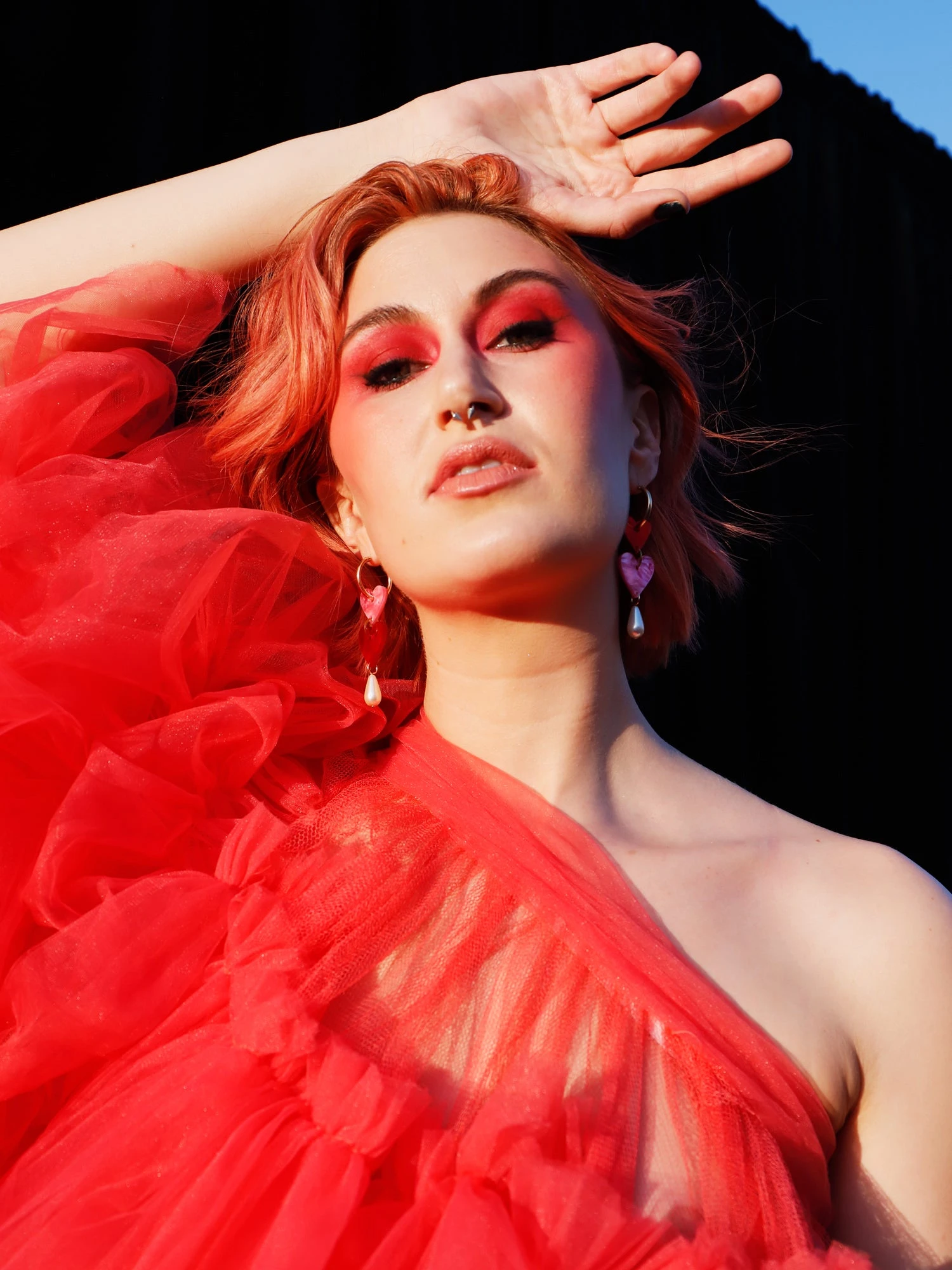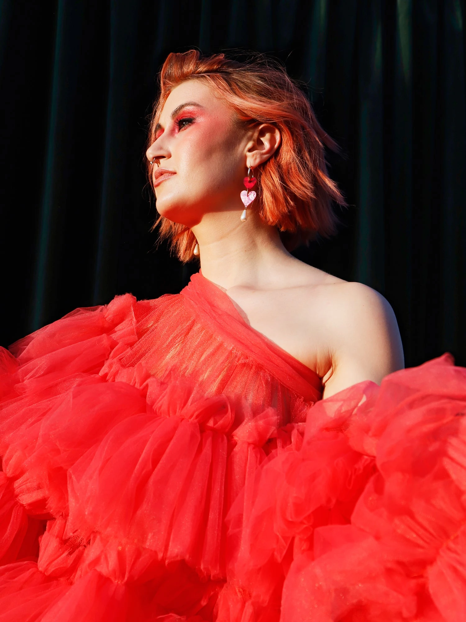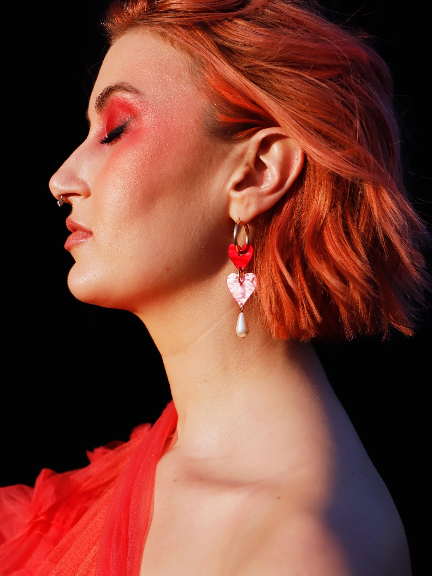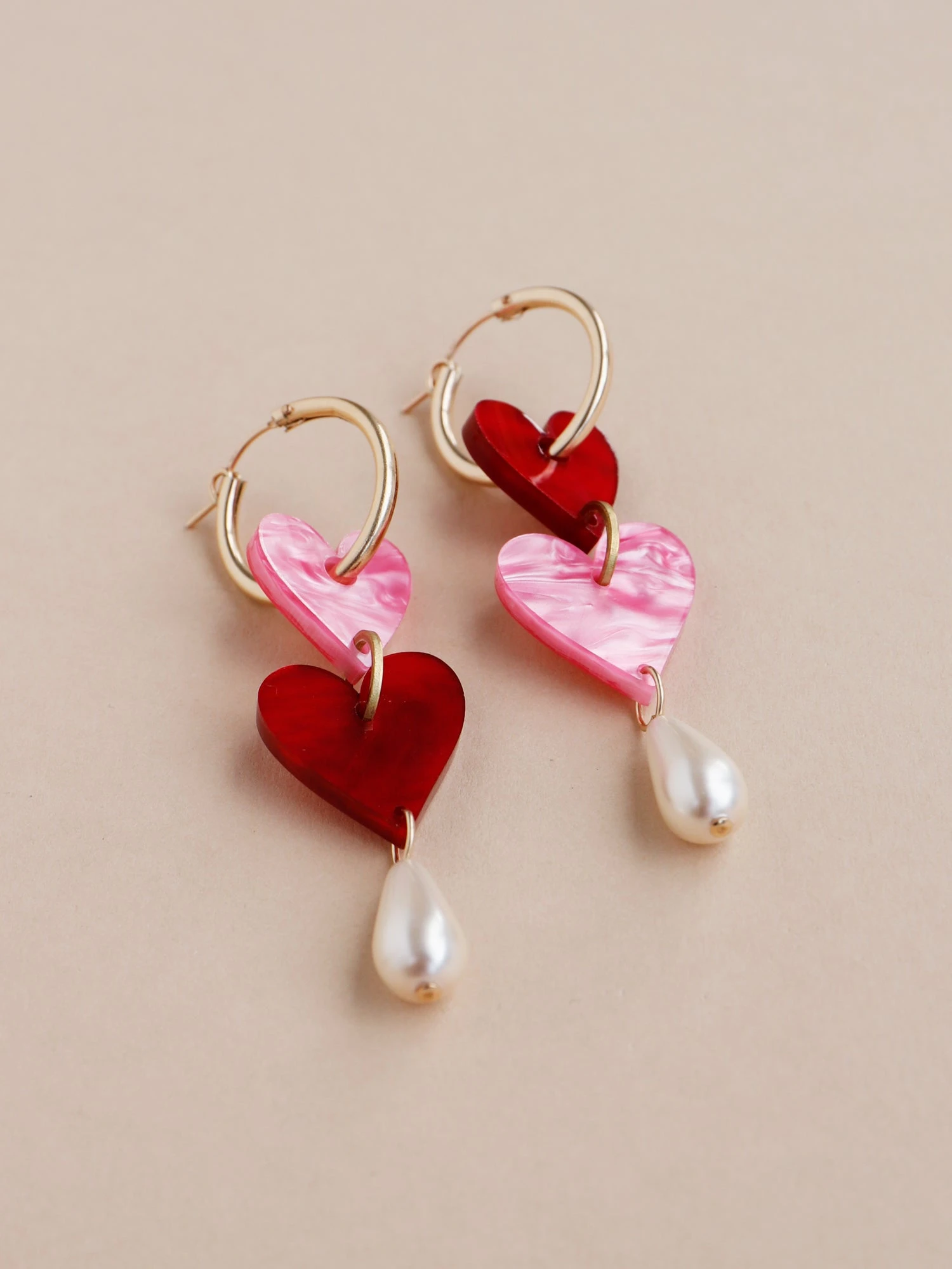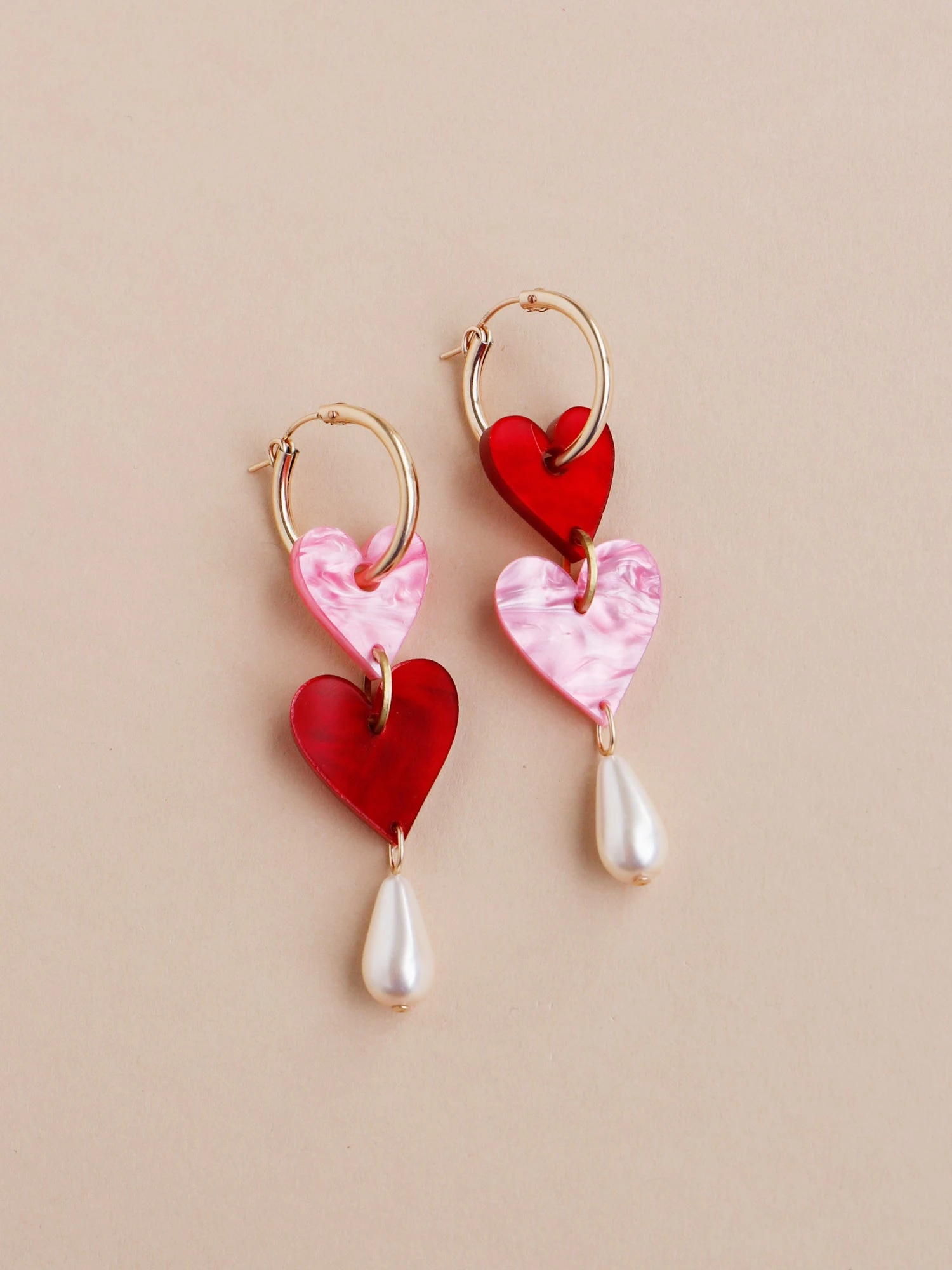 Hoop earrings with gradient heart pendants made from red and pink marbled acrylic and glass beads.Â