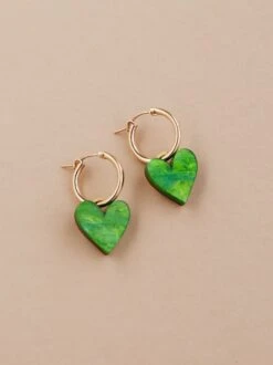 Hoop earrings with mini heart pendants made from shimmery green marble acrylic.Â