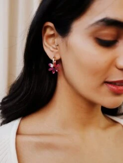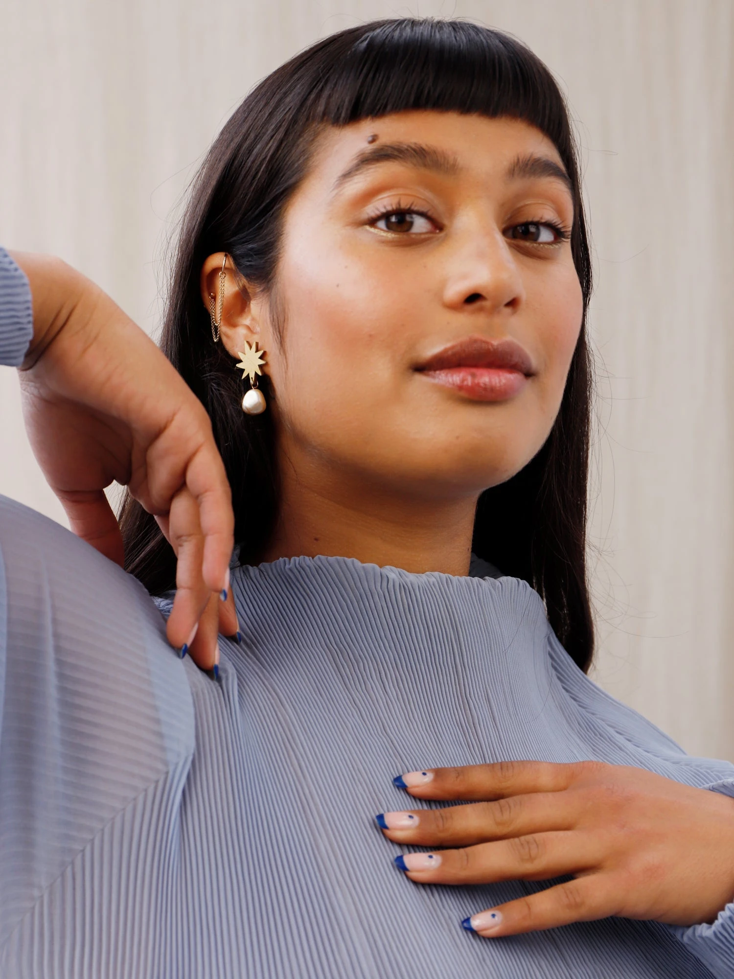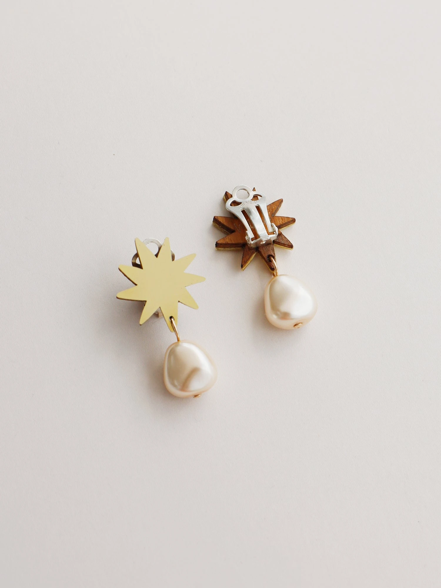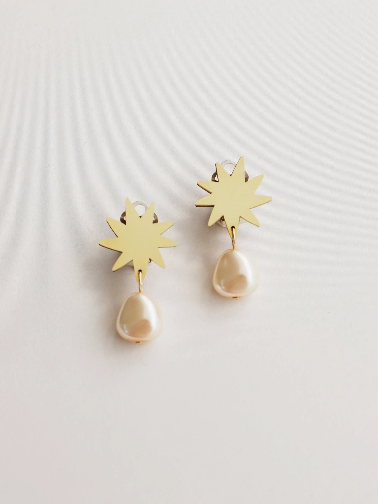 Elegant drop studs, inspired by Matisse’s cutout-style stars. Made in brass with our signature wood base, Czech glass baroque pearls and sterling silver earring clips.Â