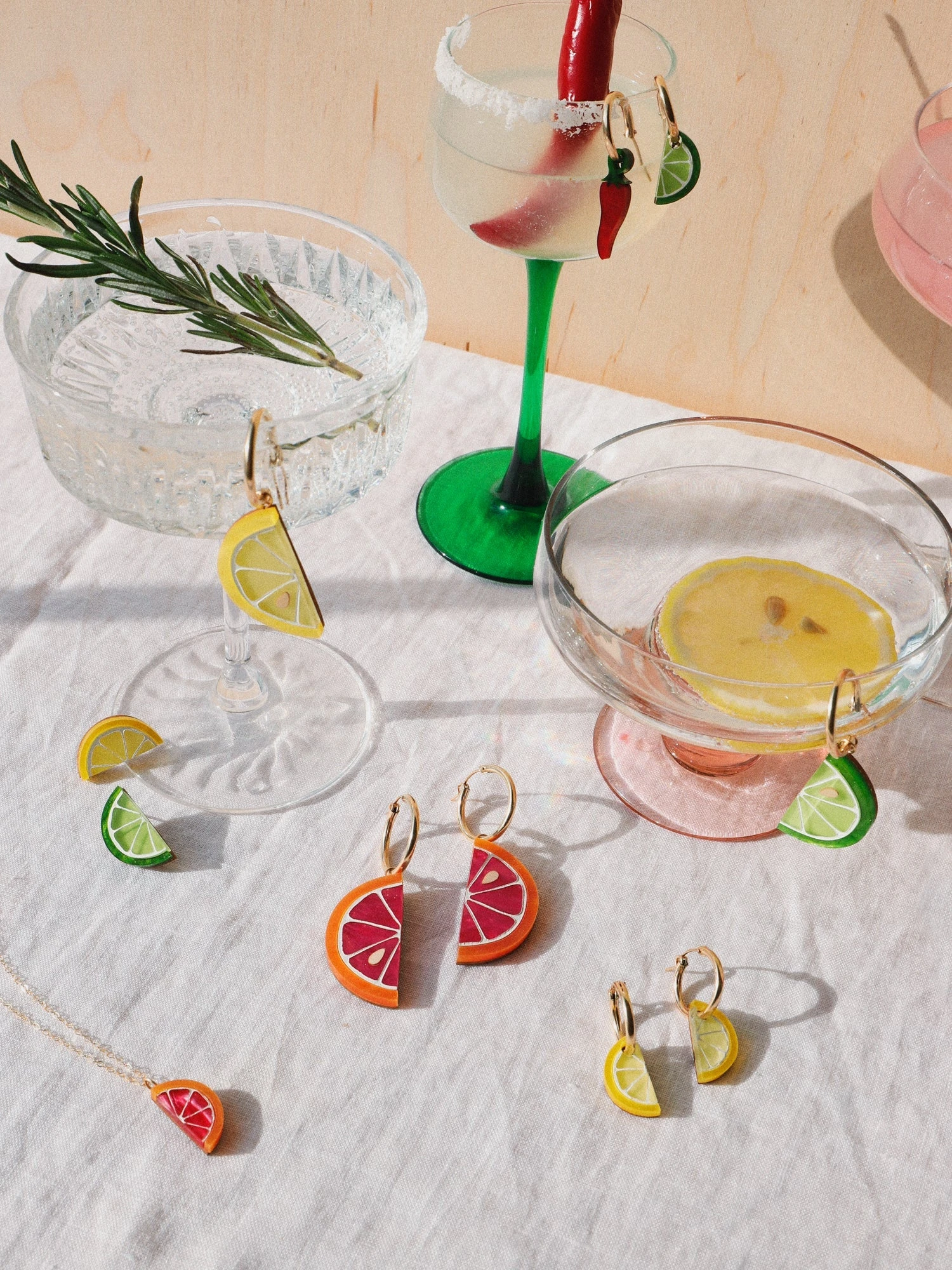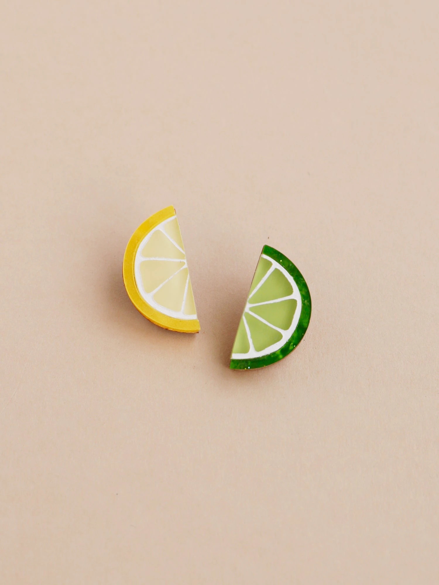 Garnish your outfit with a slice of lemon & lime! Our mini studs are made from acrylic, wood and sterling silver clip on clasps with hand-inked details.