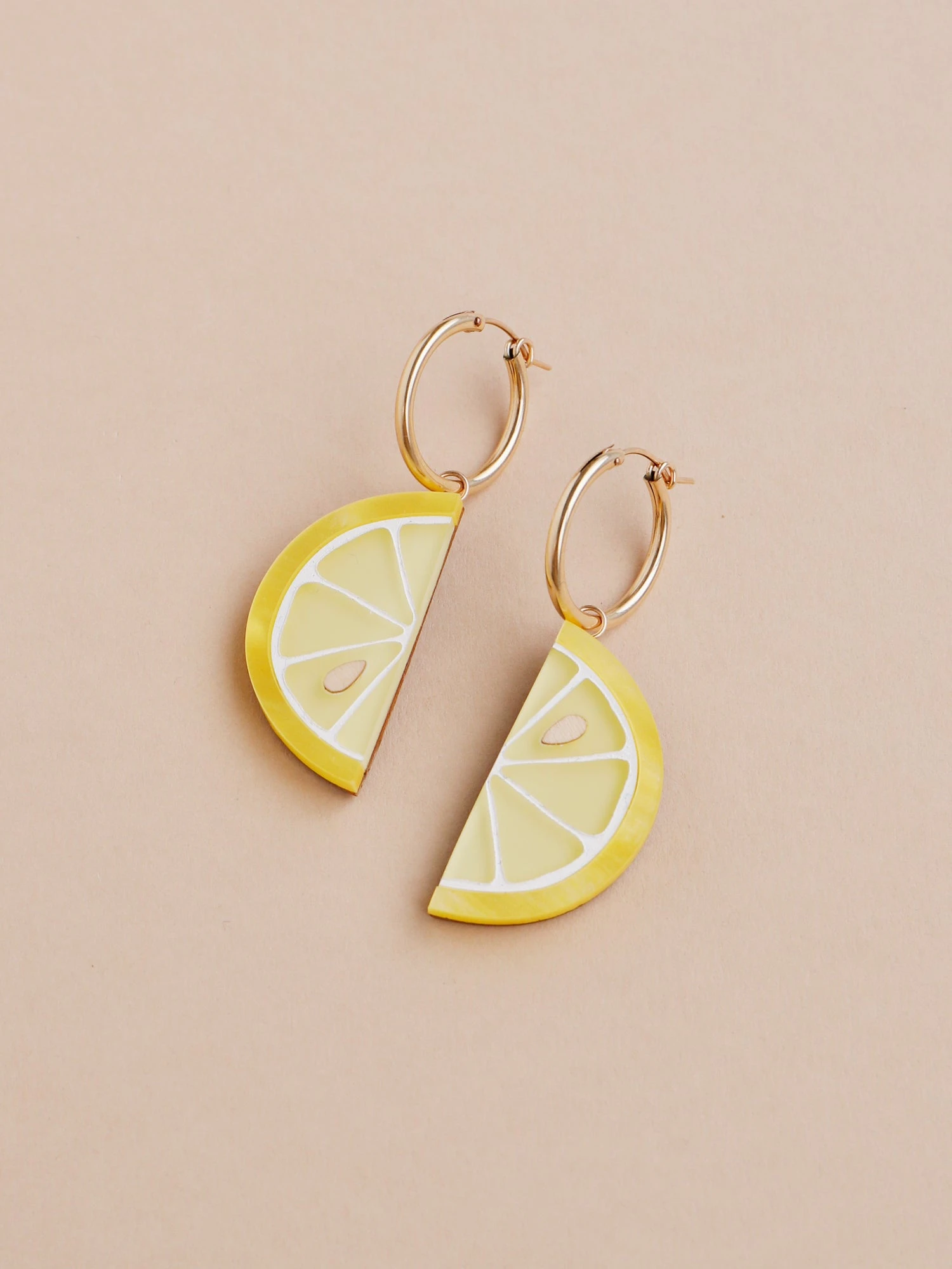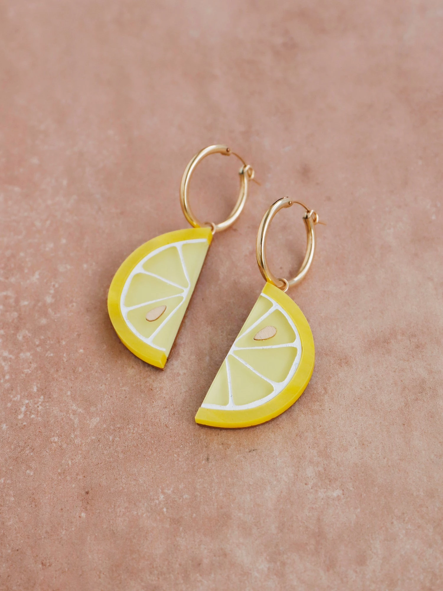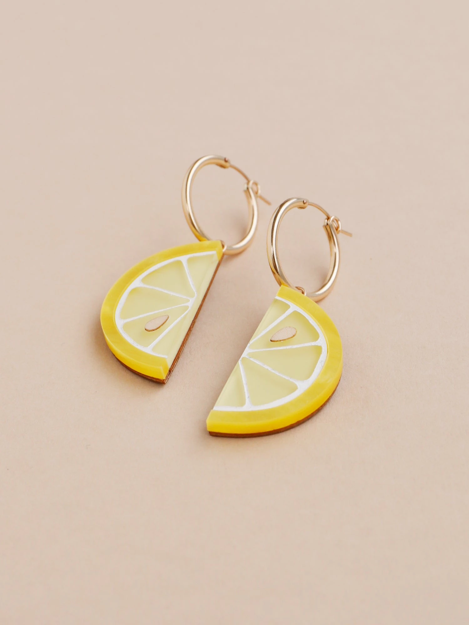 Squeeze some joy into your style with these zesty lemon earrings, made from acrylic, wood and 14k gold-filled findings.