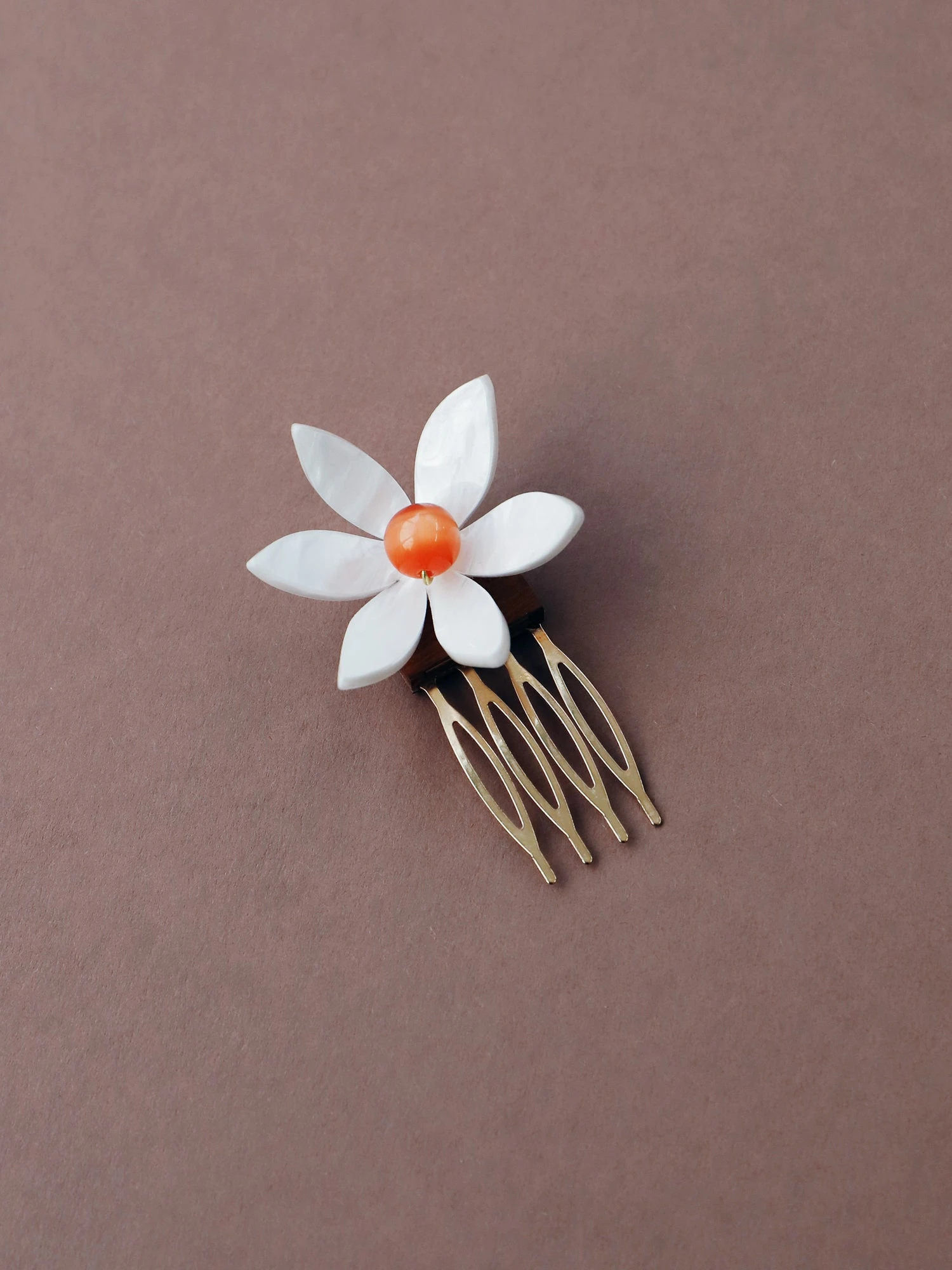 Each flower is made from hand-formed acrylic and is assembled onto a small wire attached to the combs. This wire allows you to move the flower around to a position that works best in your hairstyle – clever!