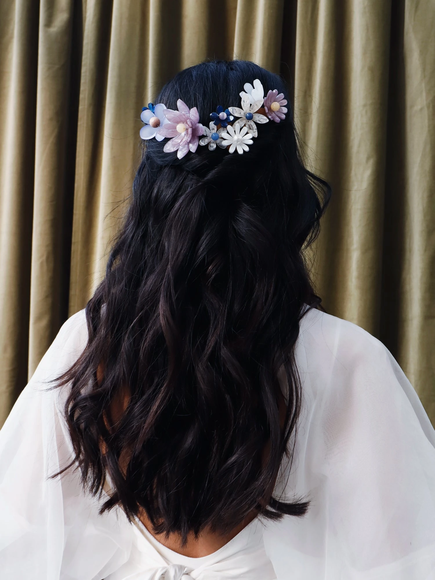 Each flower is assembled onto a small wire attached to the combs.  This wire allows you to move the flower around to a position that works best in your hairstyle – clever!