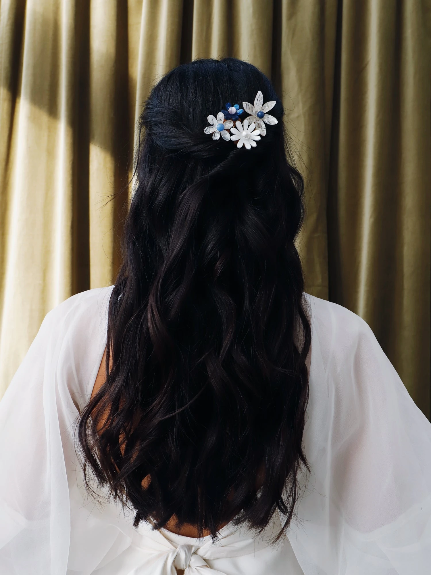 Model wears flowers on gold-tone combs.