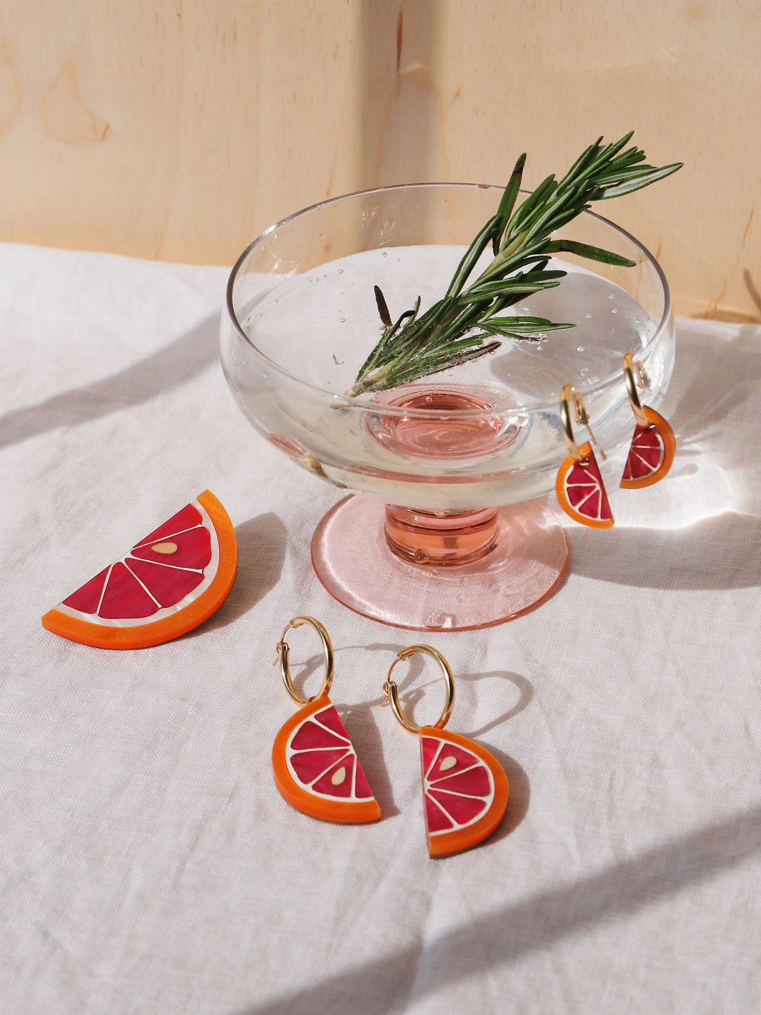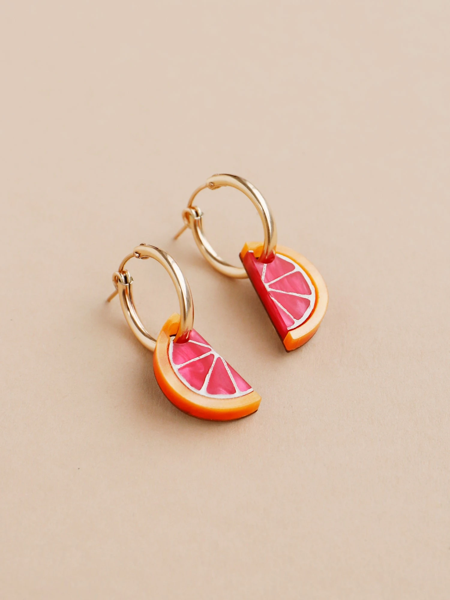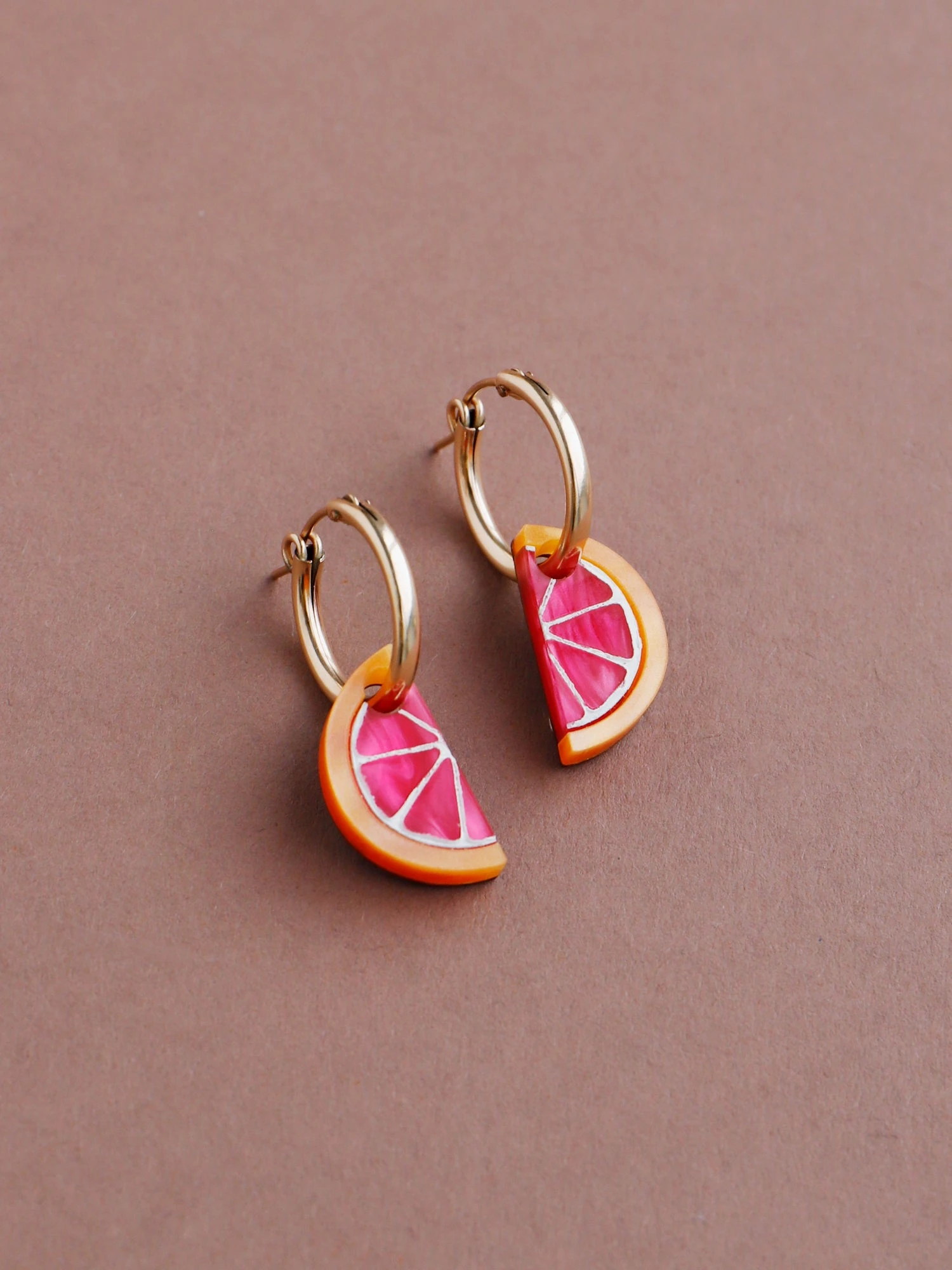 Squeeze some joy into your style with these juicy grapefruit earrings, made from acrylic, wood and 14k gold-filled findings.Â