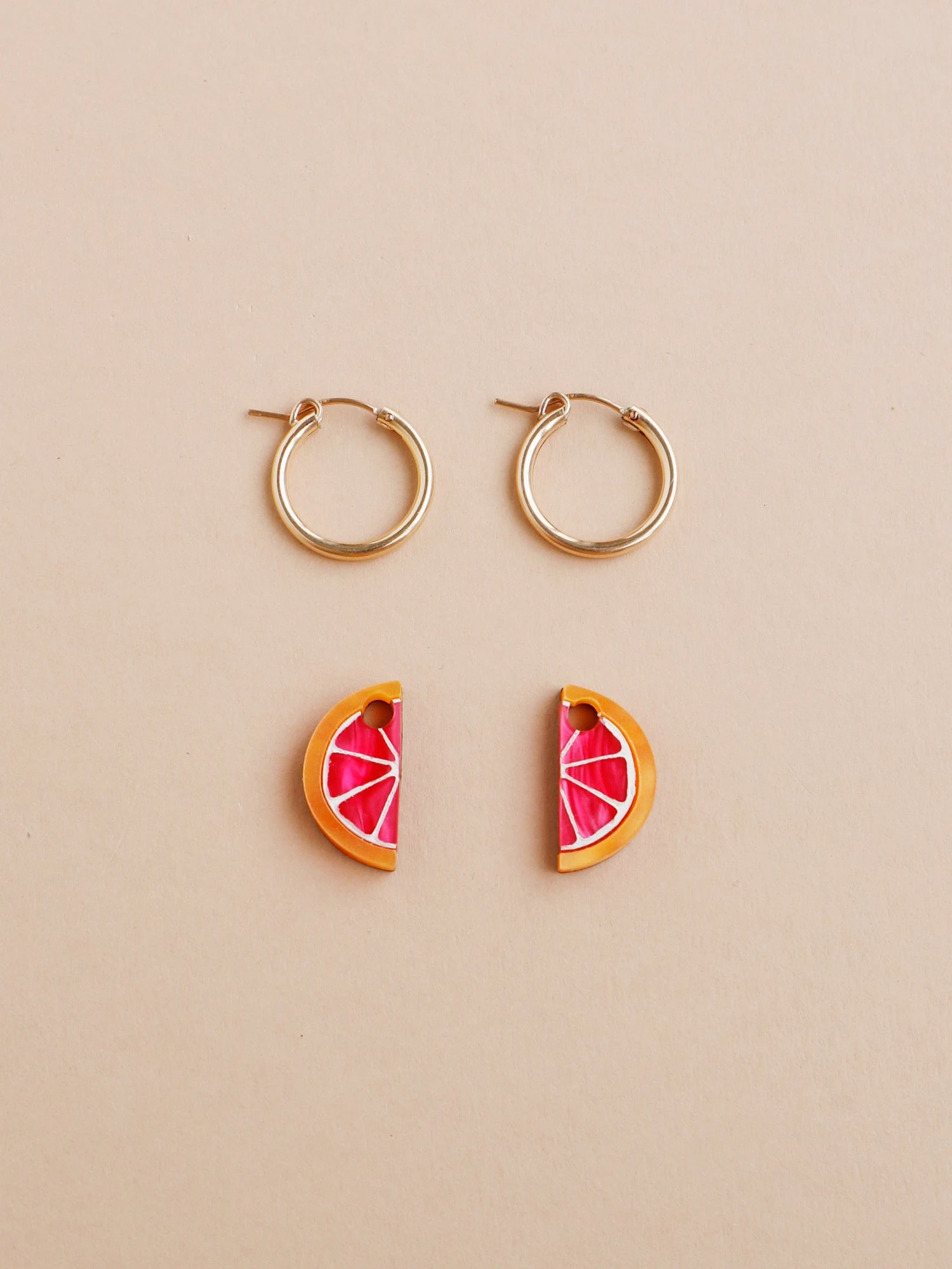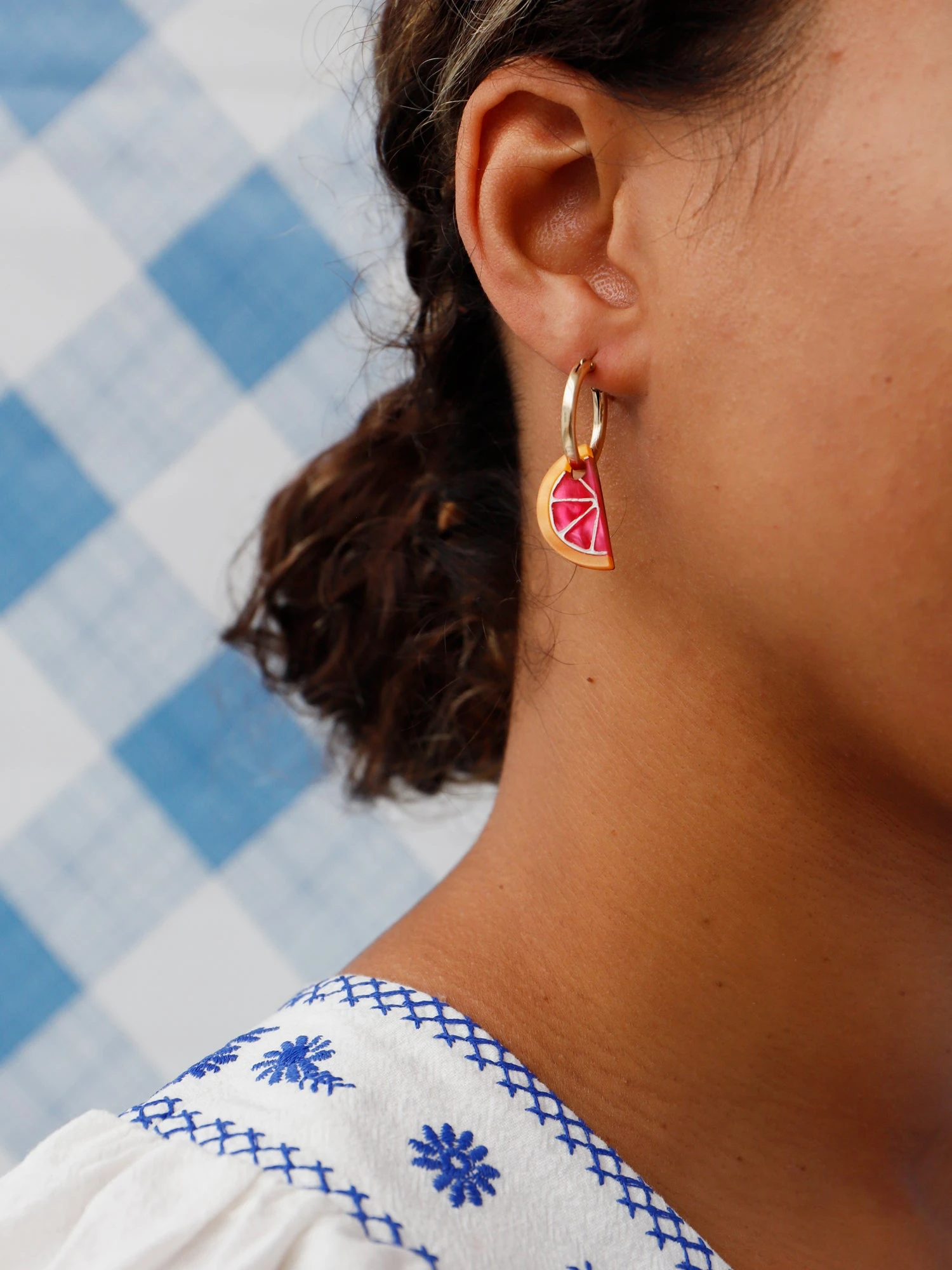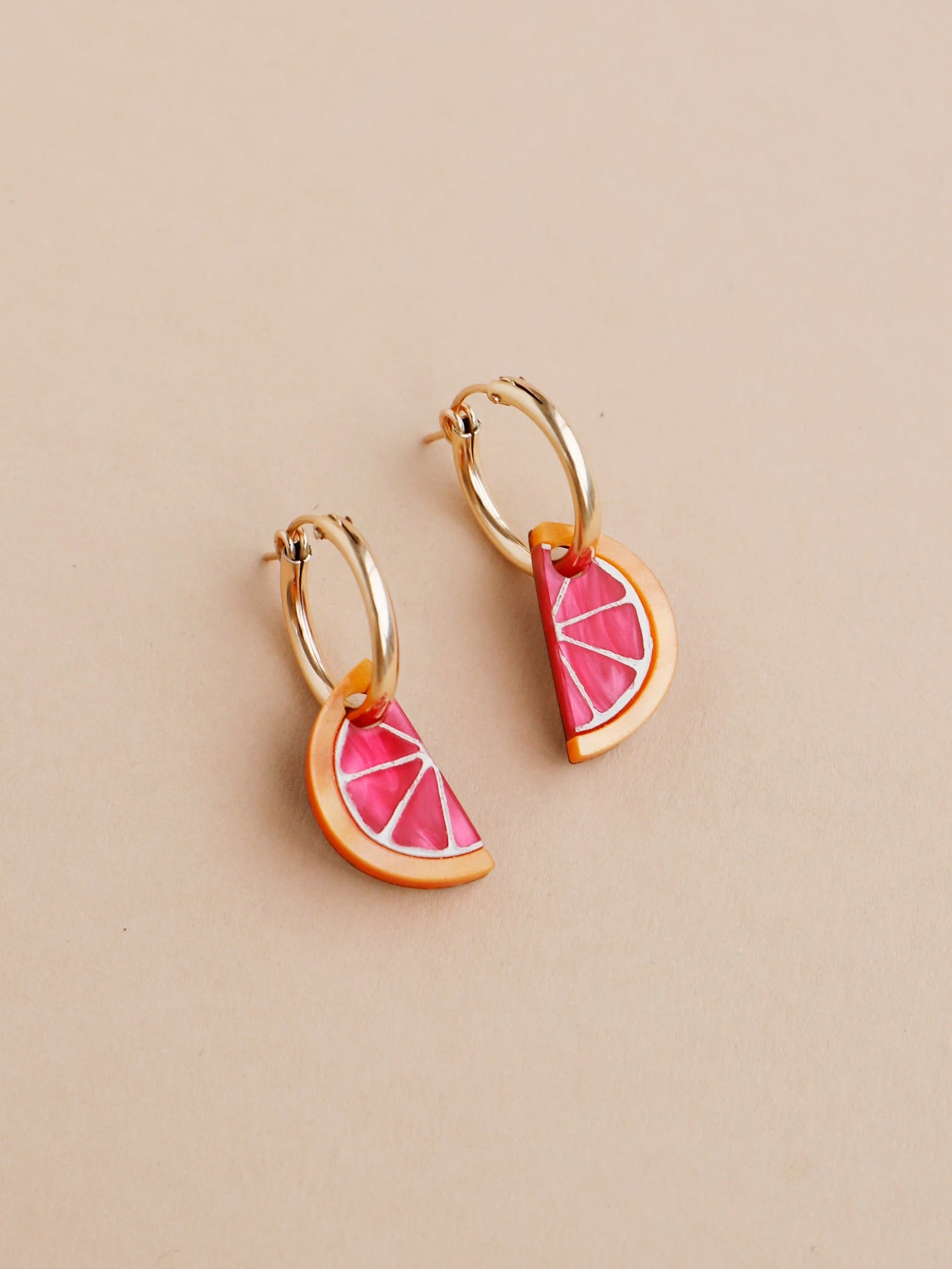Squeeze some joy into your style with these juicy grapefruit earrings, made from acrylic, wood and 14k gold-filled findings.Â