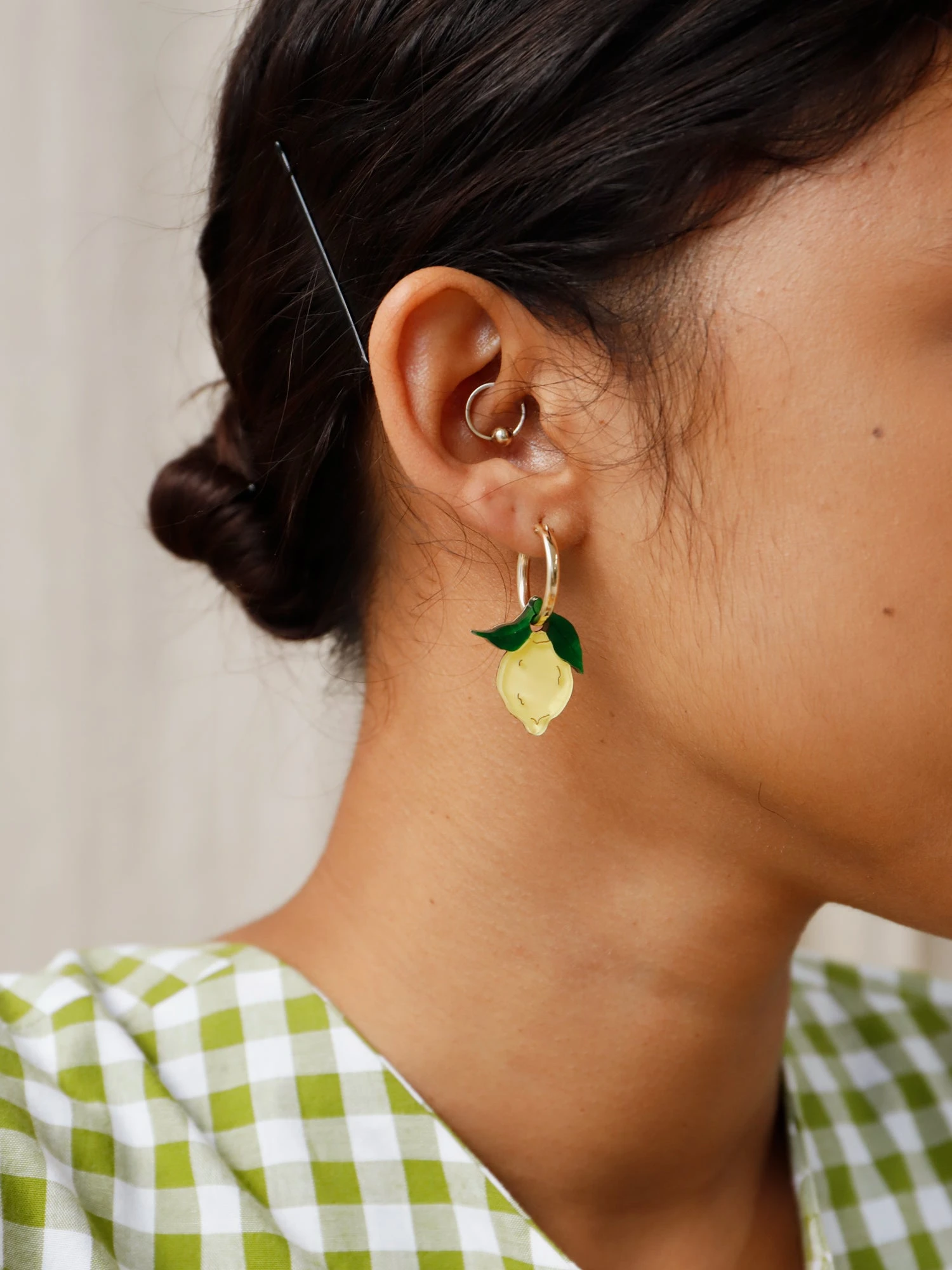 These zesty lemon earrings are giving us all the best Italian summer feels. Â Made with wood, 64% recycled acrylic and hand-inked details.