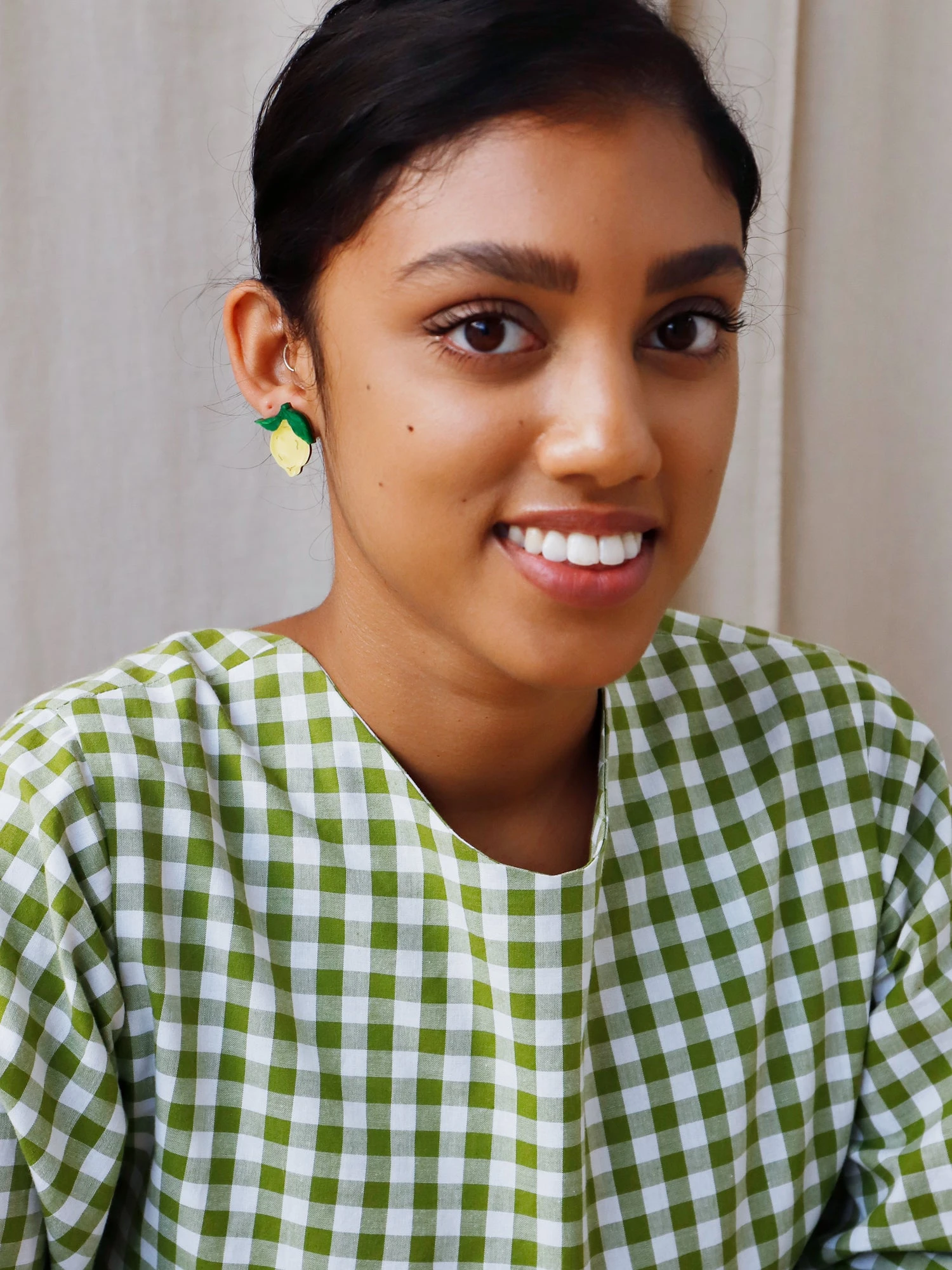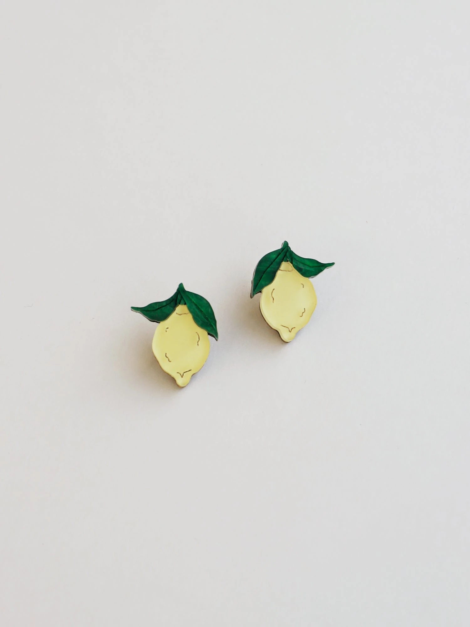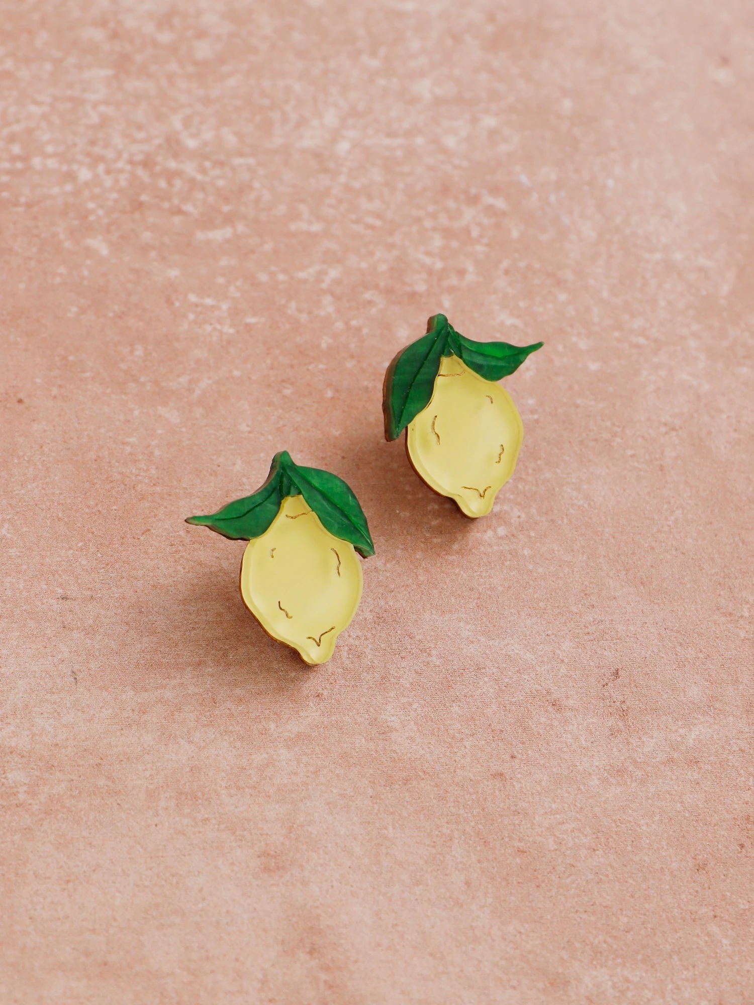 These zesty lemon earrings are giving us all the best Italian summer feels.  Made with wood, 64% recycled acrylic and hand-inked details with sterling silver earring posts & butterflies.