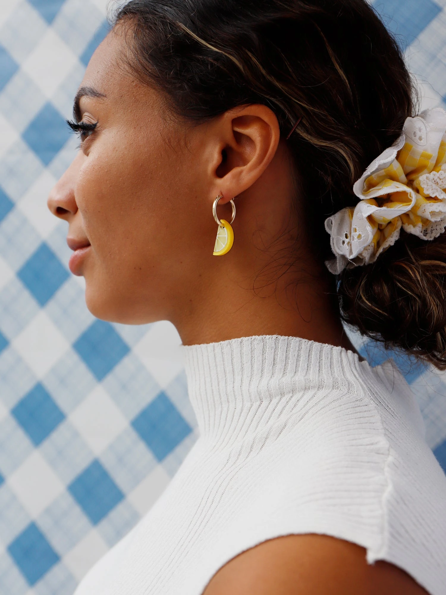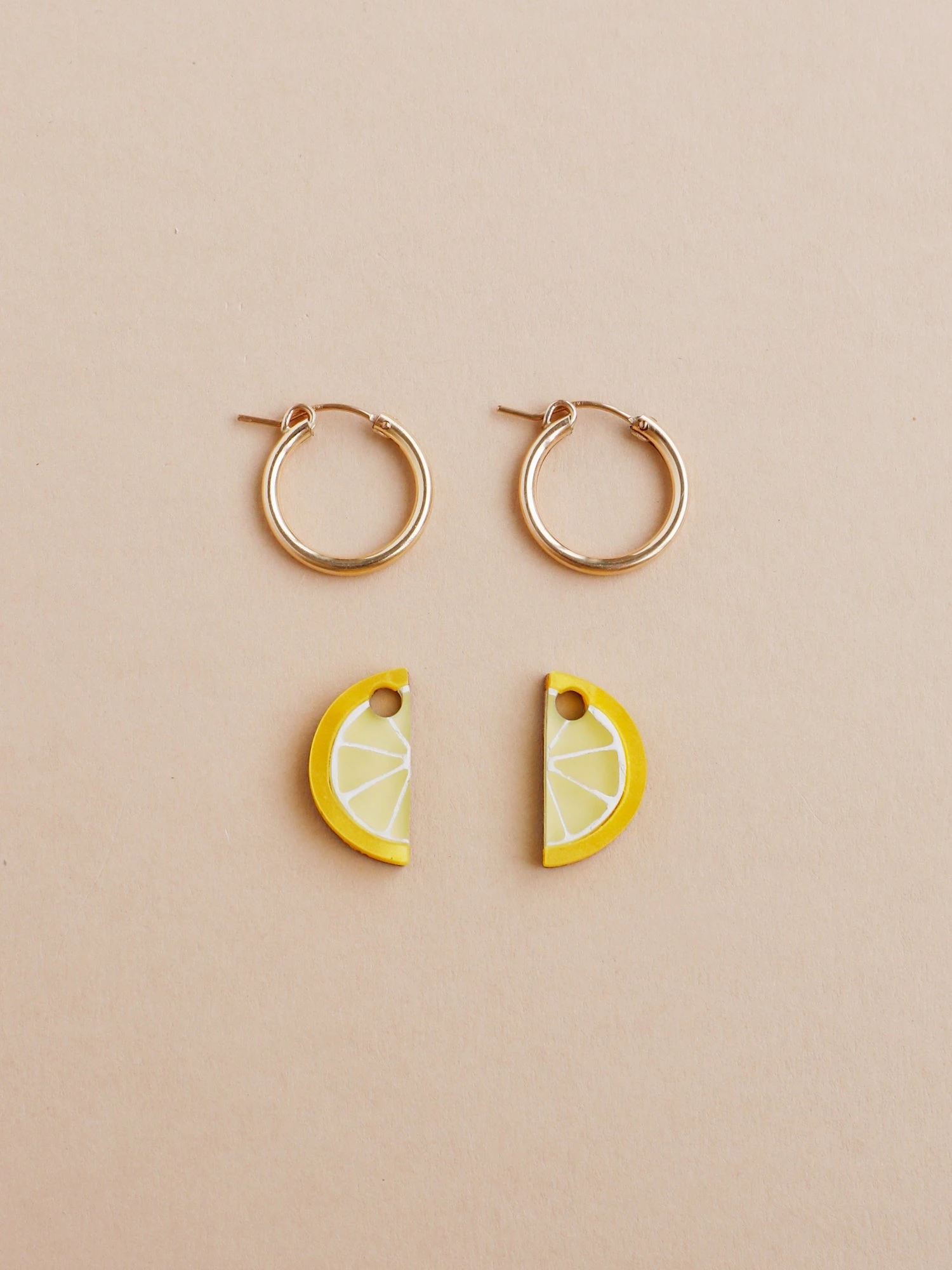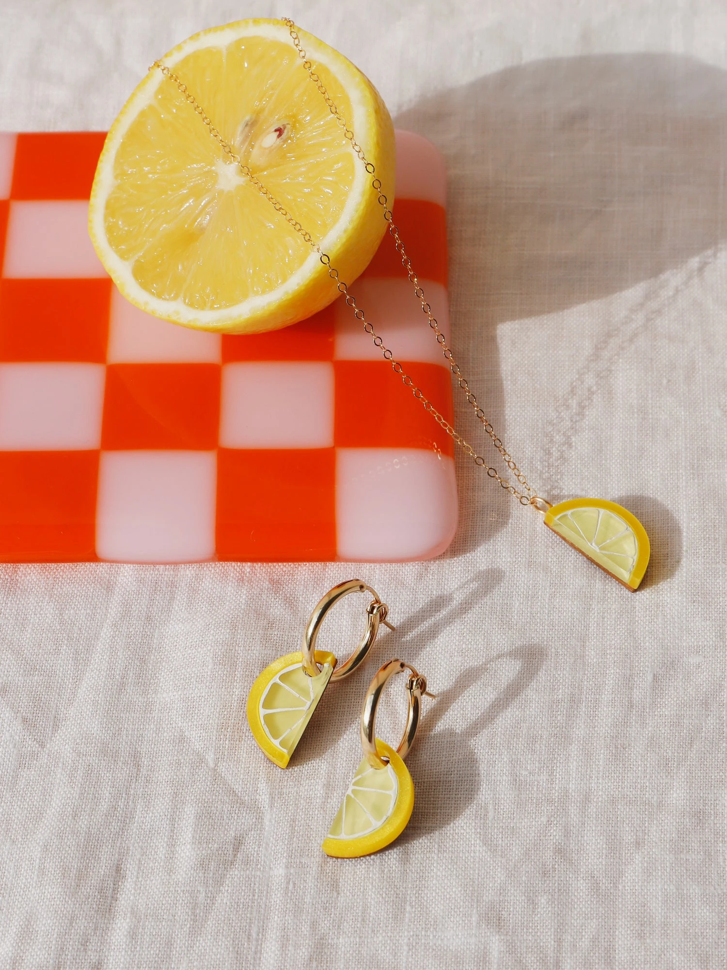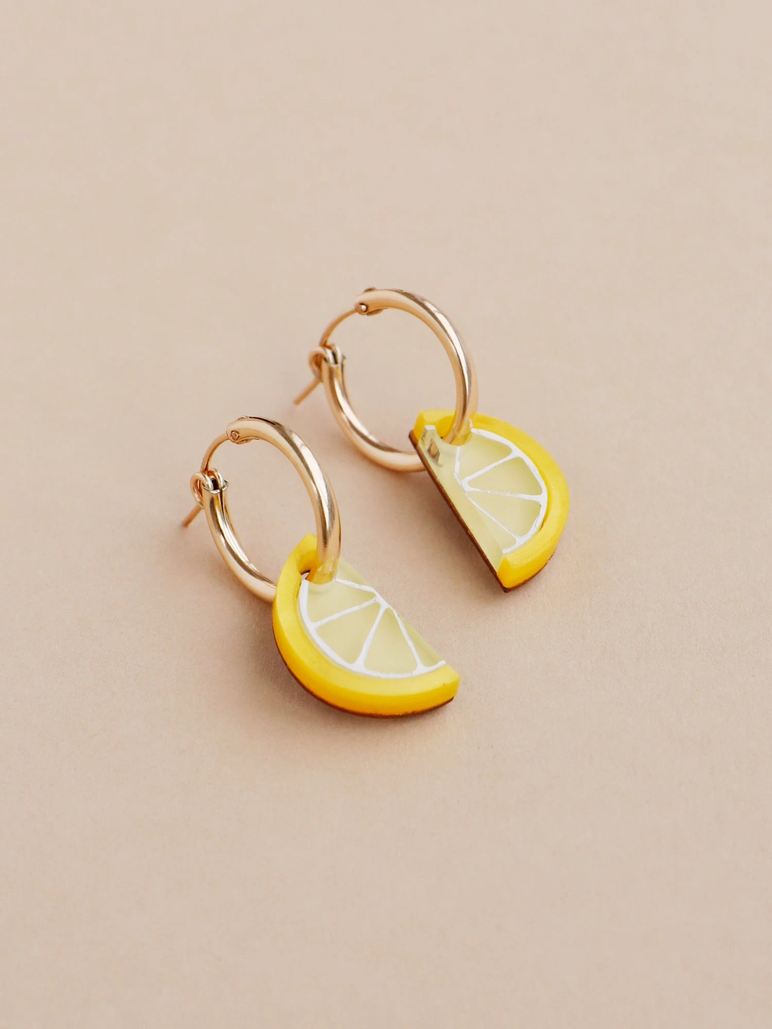 Squeeze some joy into your style with these zesty lemon earrings, made from acrylic, wood and 14k gold-filled findings.Â