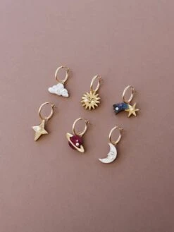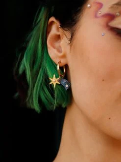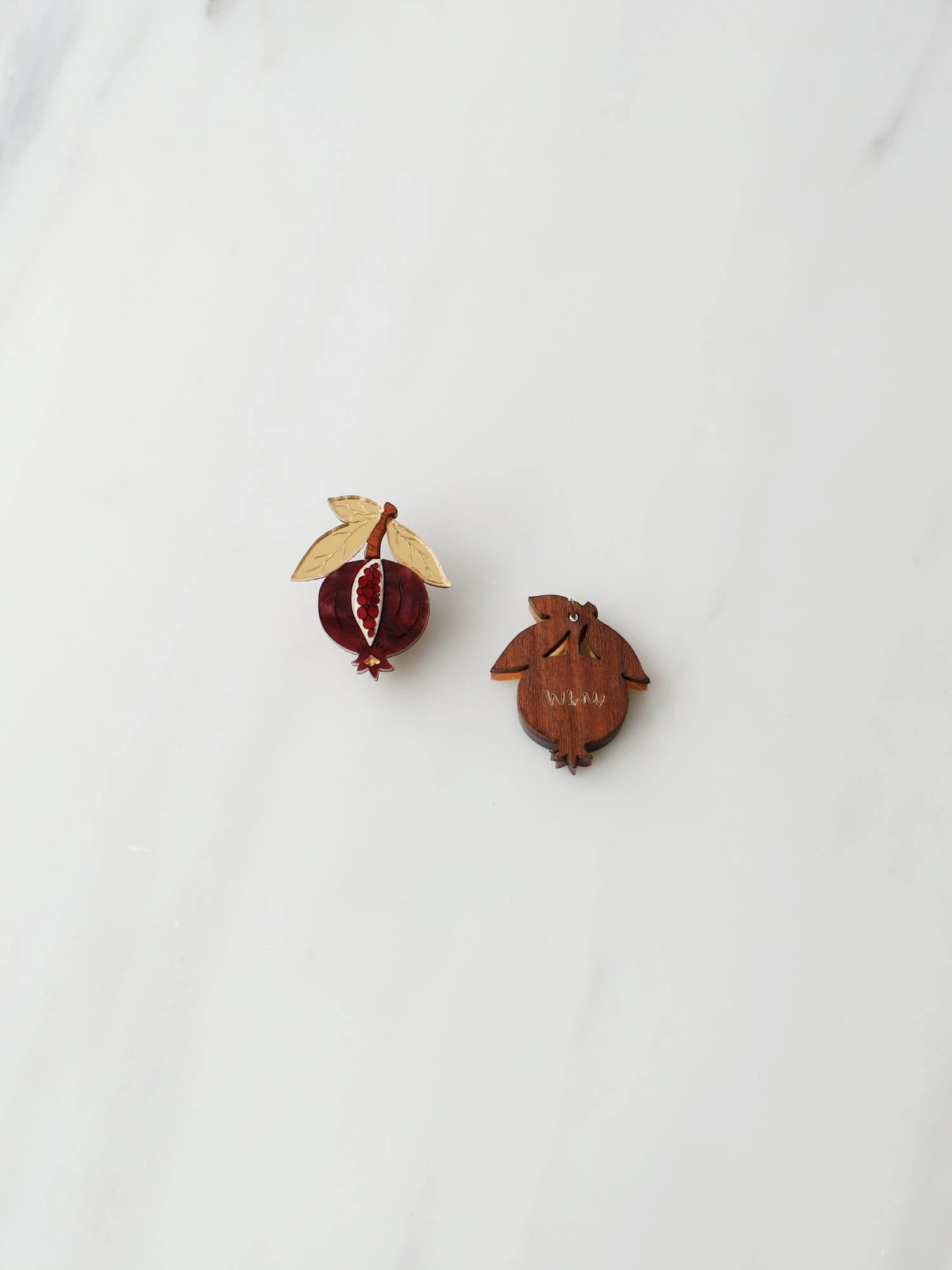 Pomegranate stud earrings made with wood, acrylic and hand-inked details.