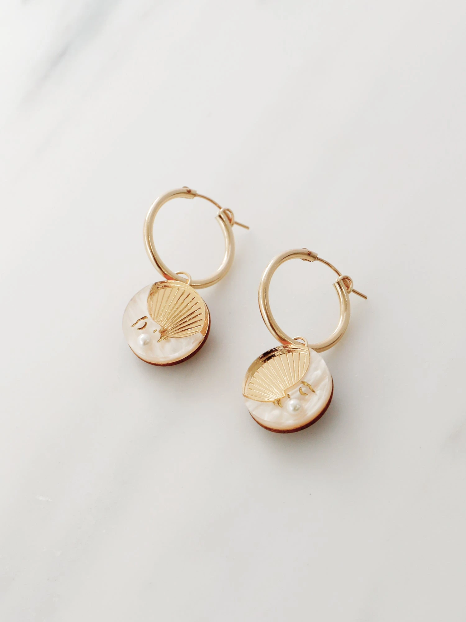 A dreamy pair of moon hoops! Â Made with acrylic and wood, with hand-inked illustration and Czech glass pearl detail.Â