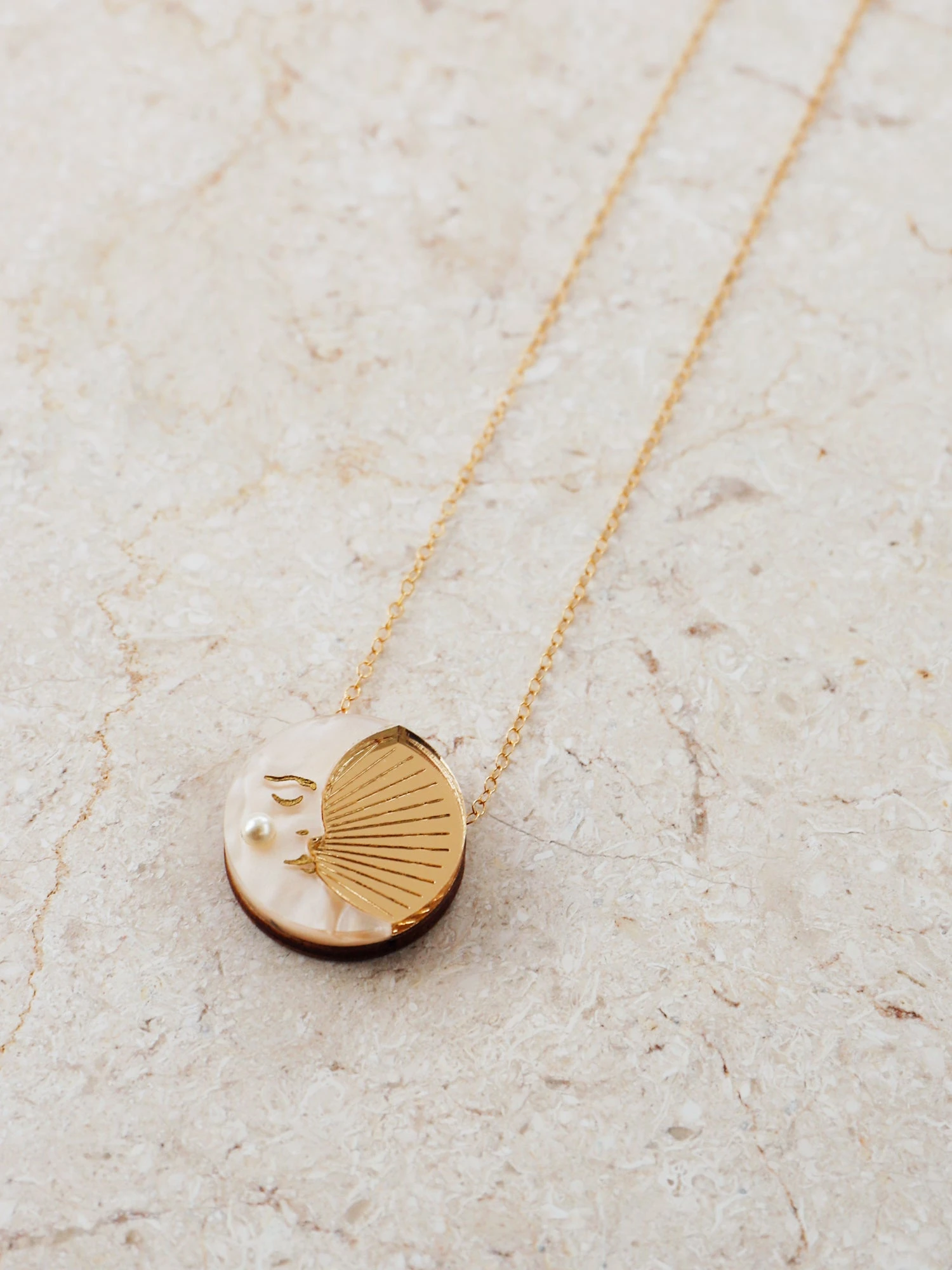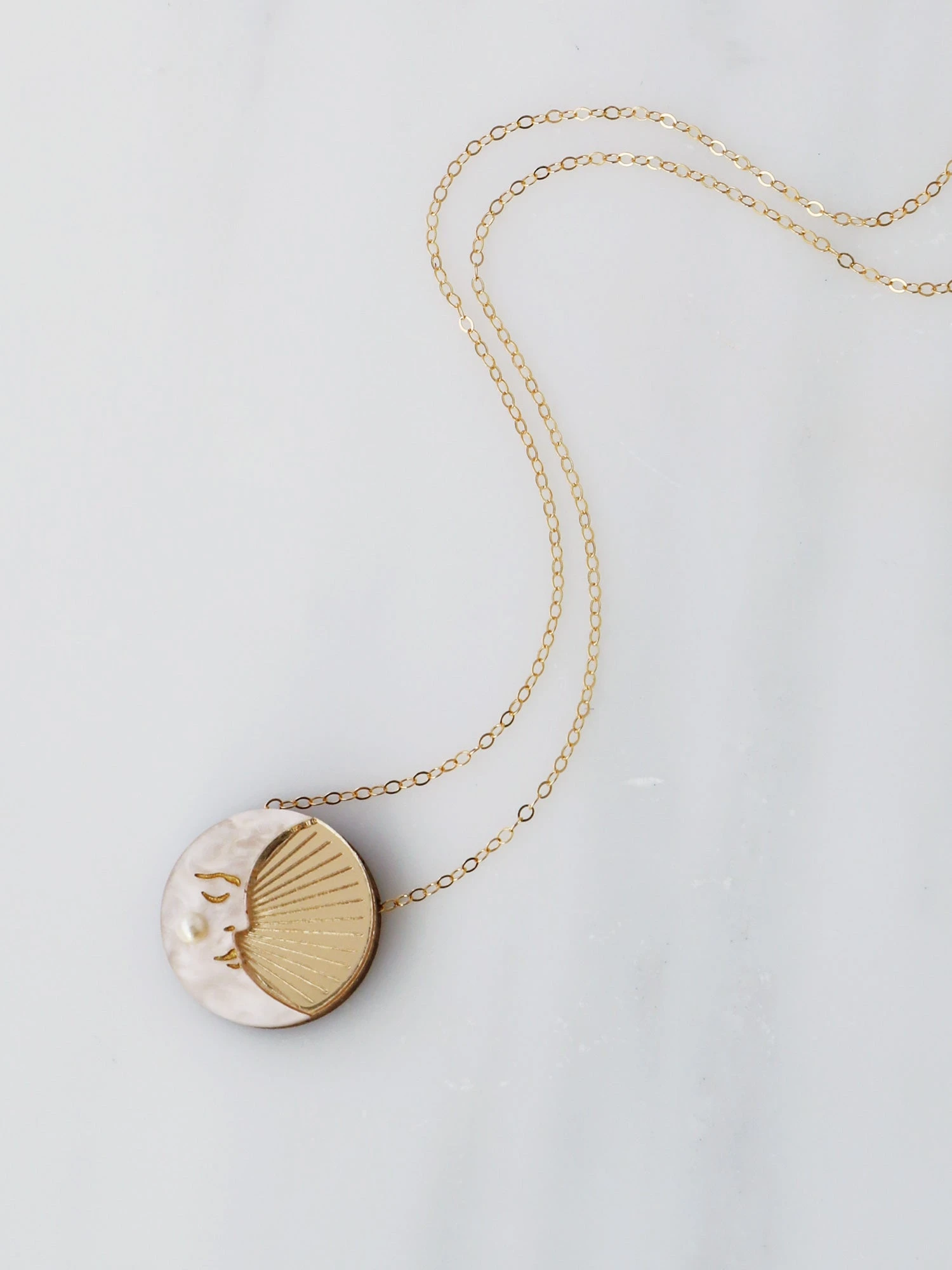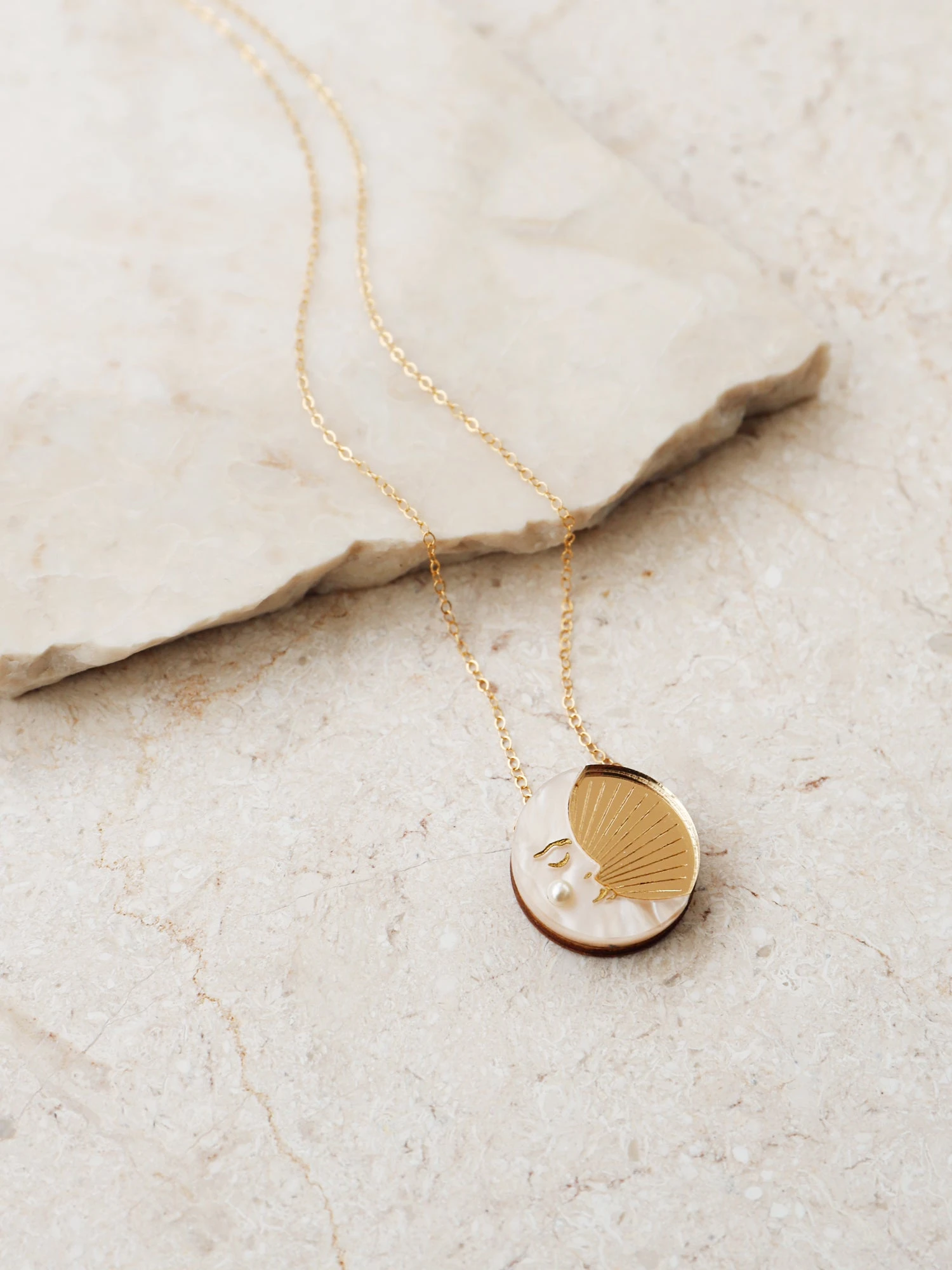 Moon necklace made using gold mirror acrylic and cream marbled acrylic with hand-inked surface illustration and Czech glass pearl detail.