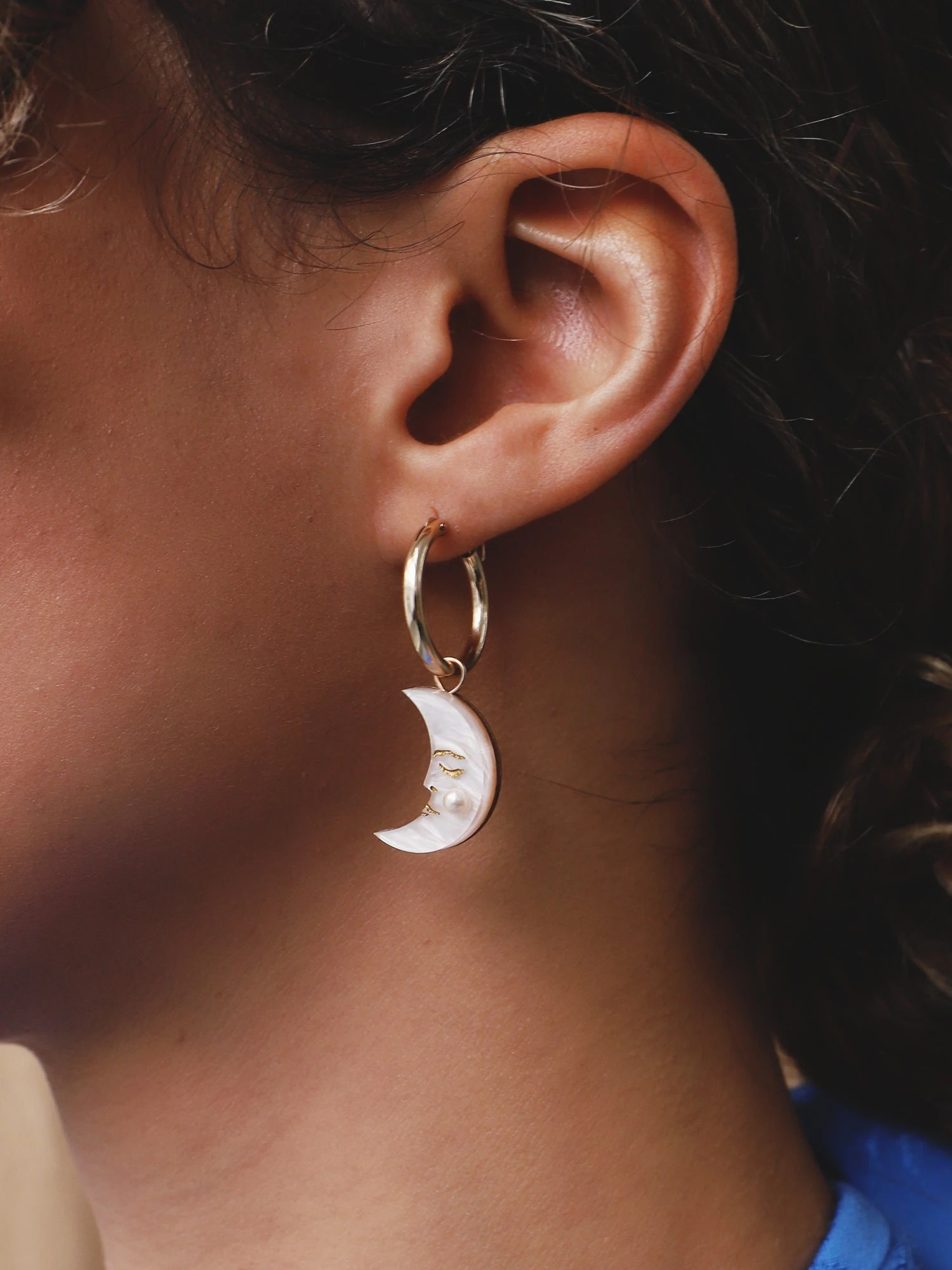 Hoop earrings with mismatched moon and star pendants, featuring hand-inked illustrations and Czech glass pearls.
