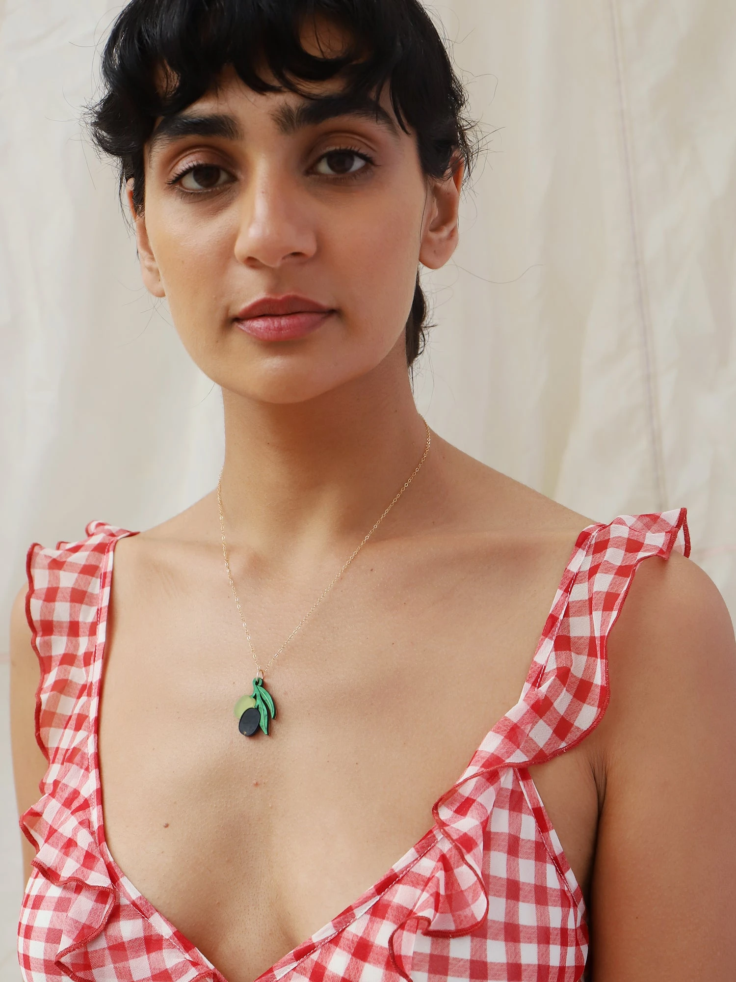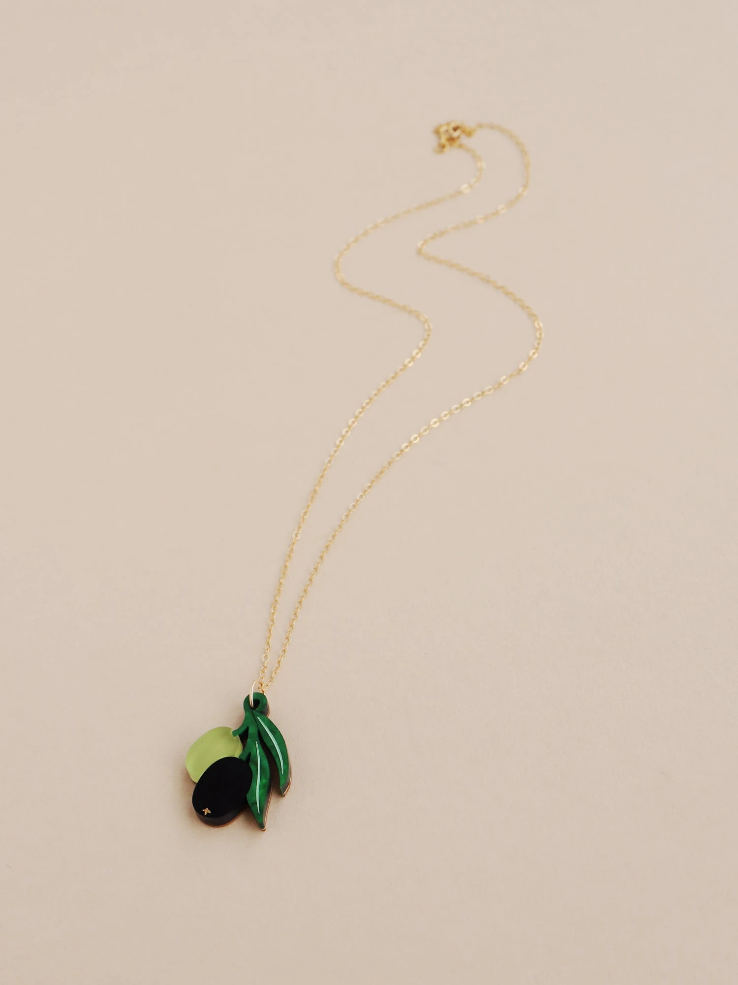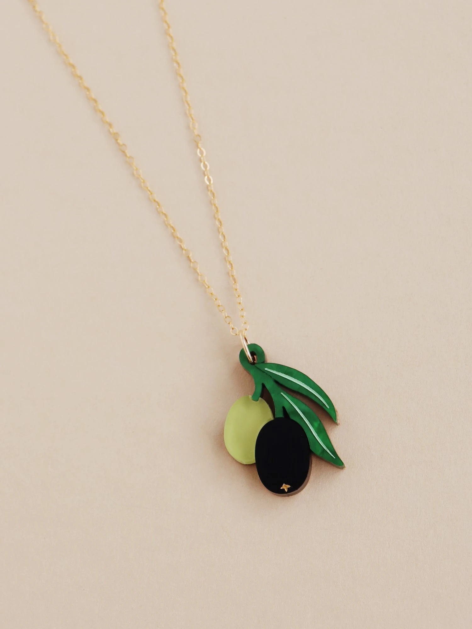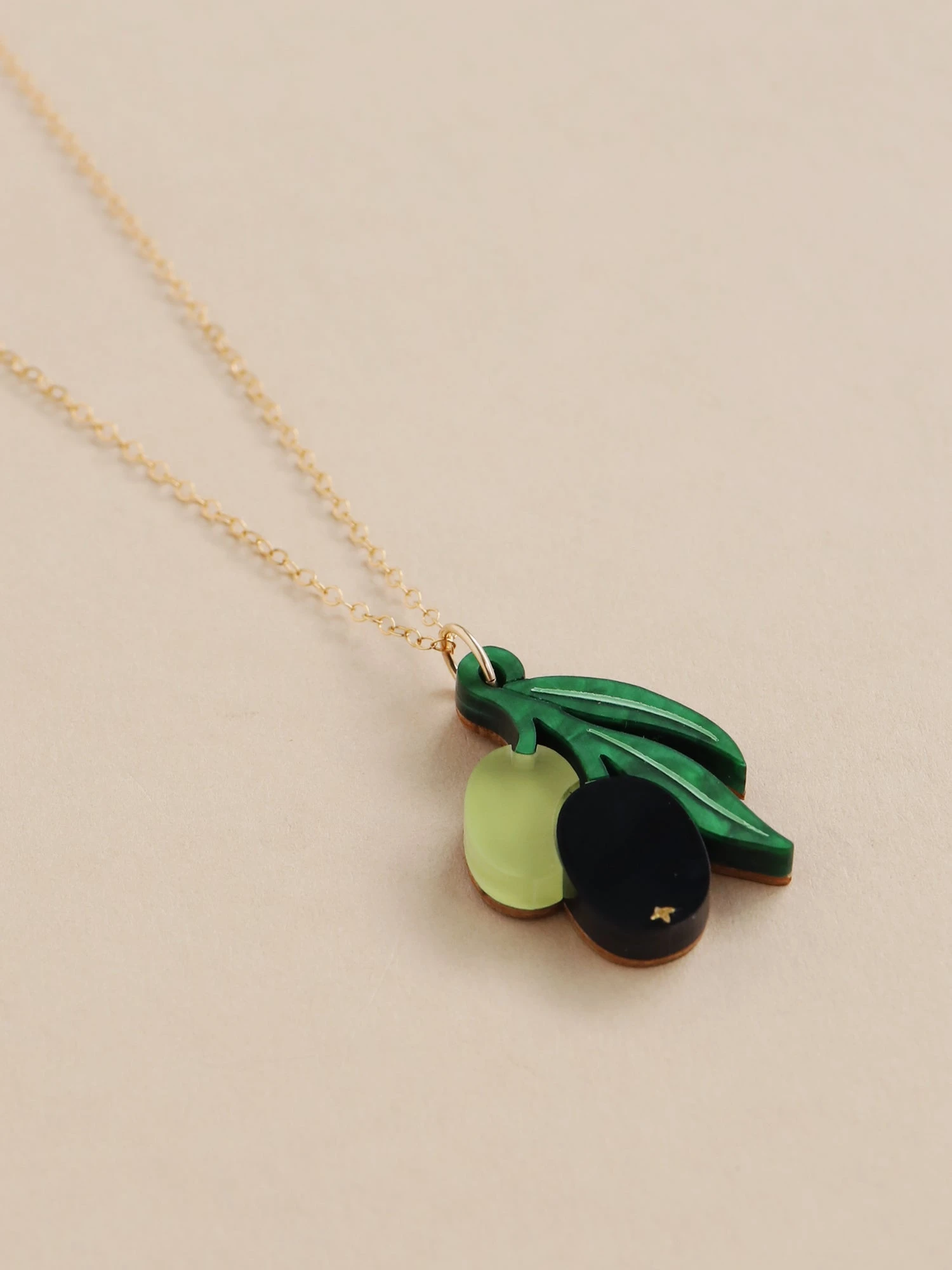 Plucked from the vineyard, our hand-crafted olive necklace is made with acrylic and hand-inked details.Â
