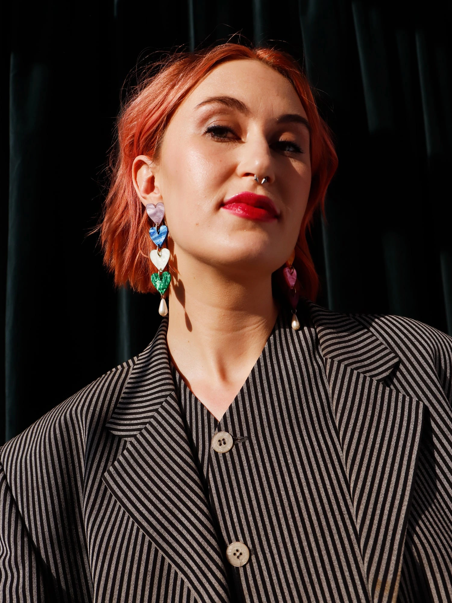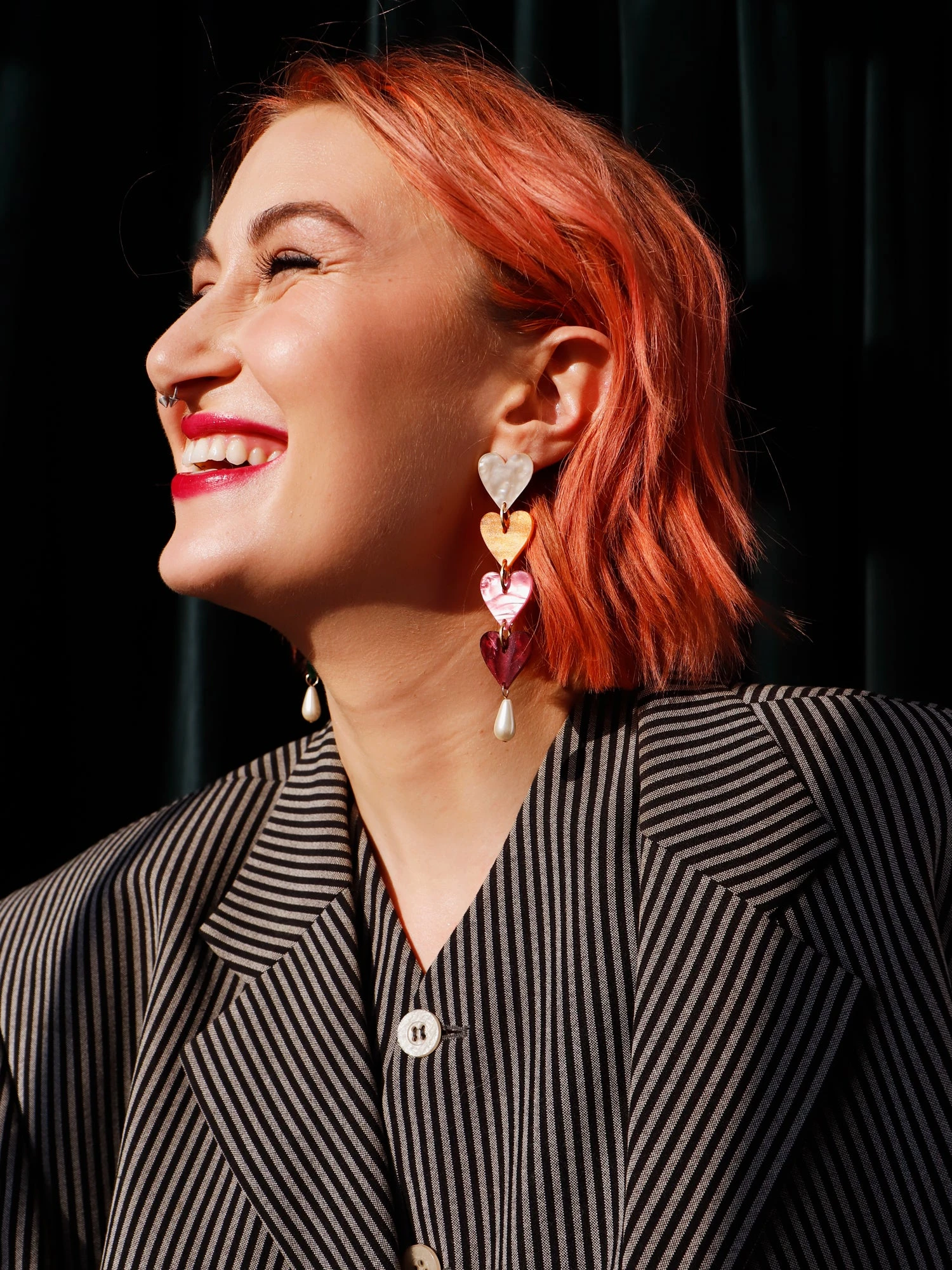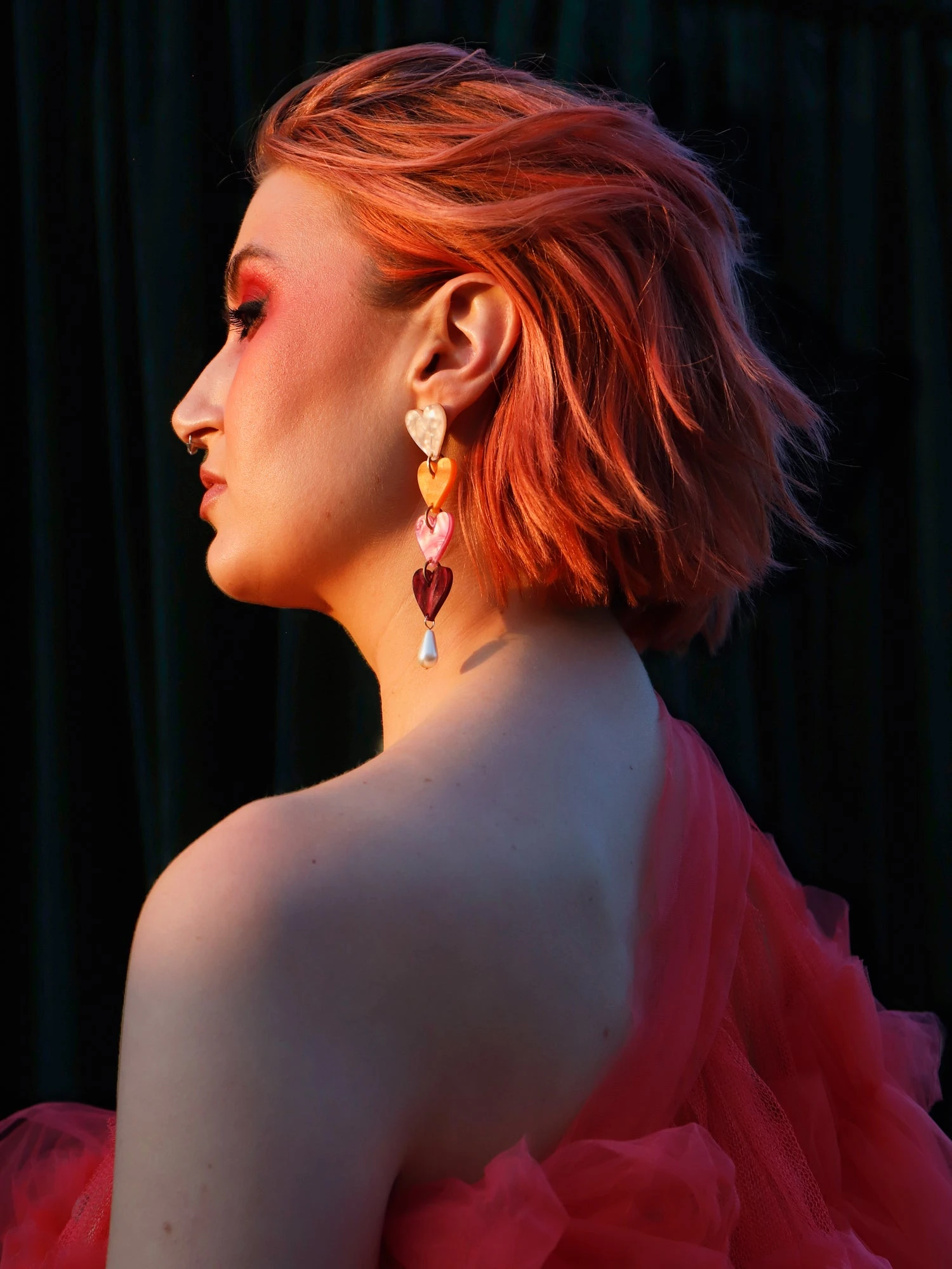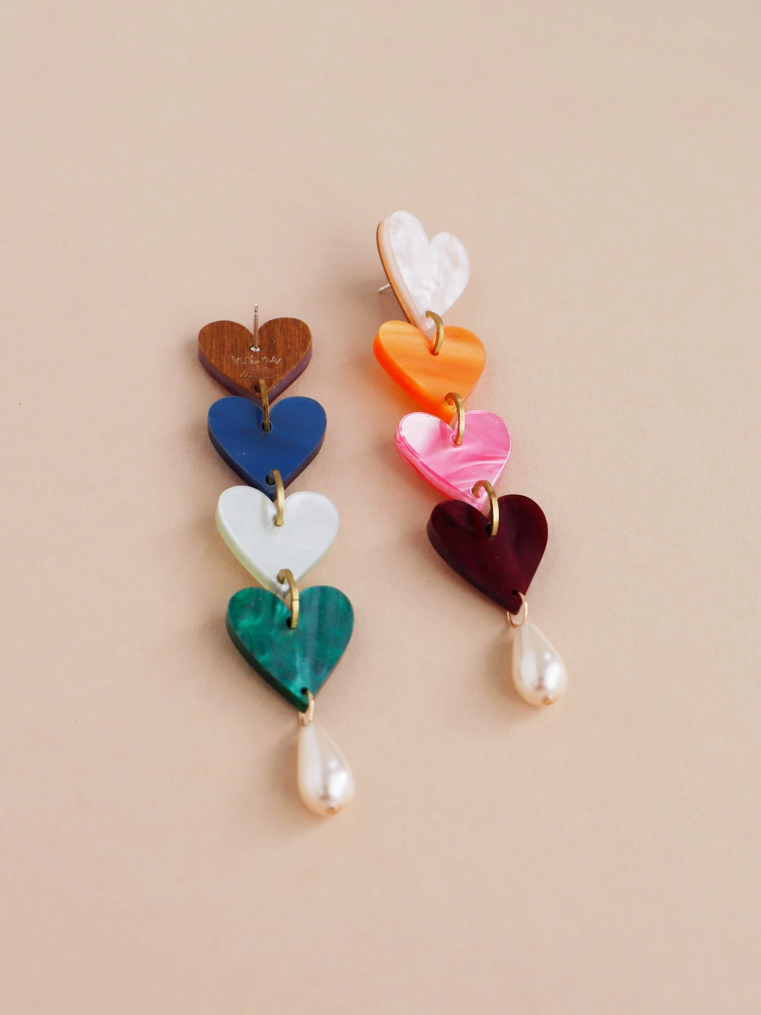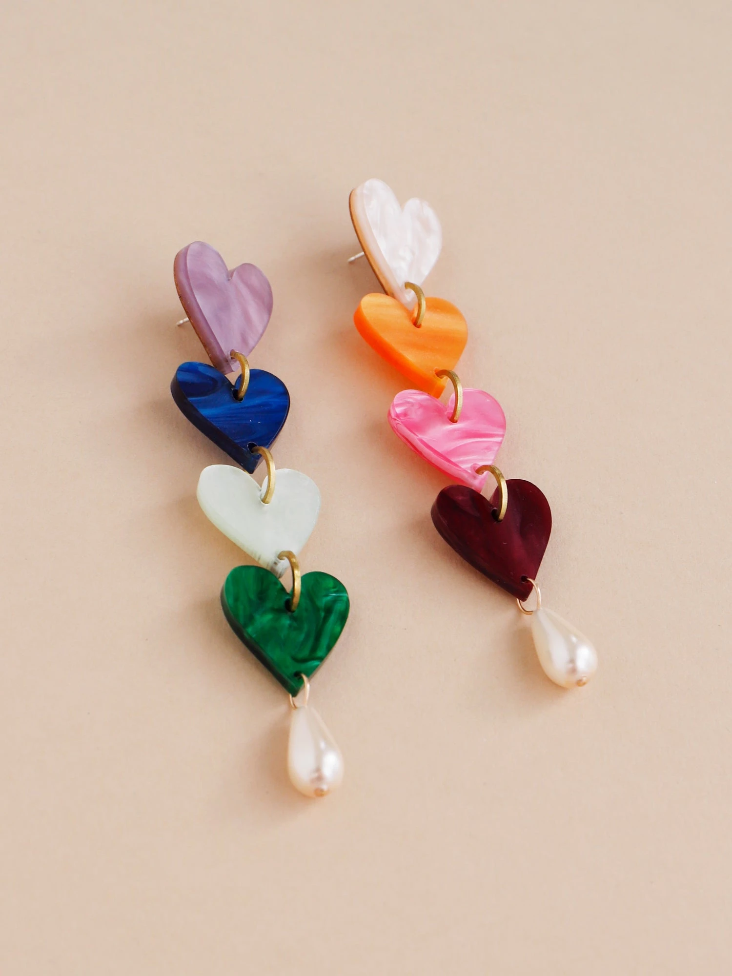 Statement earrings with rainbow coloured heart pendants, made from marble acrylic and glass pearl beads.Â