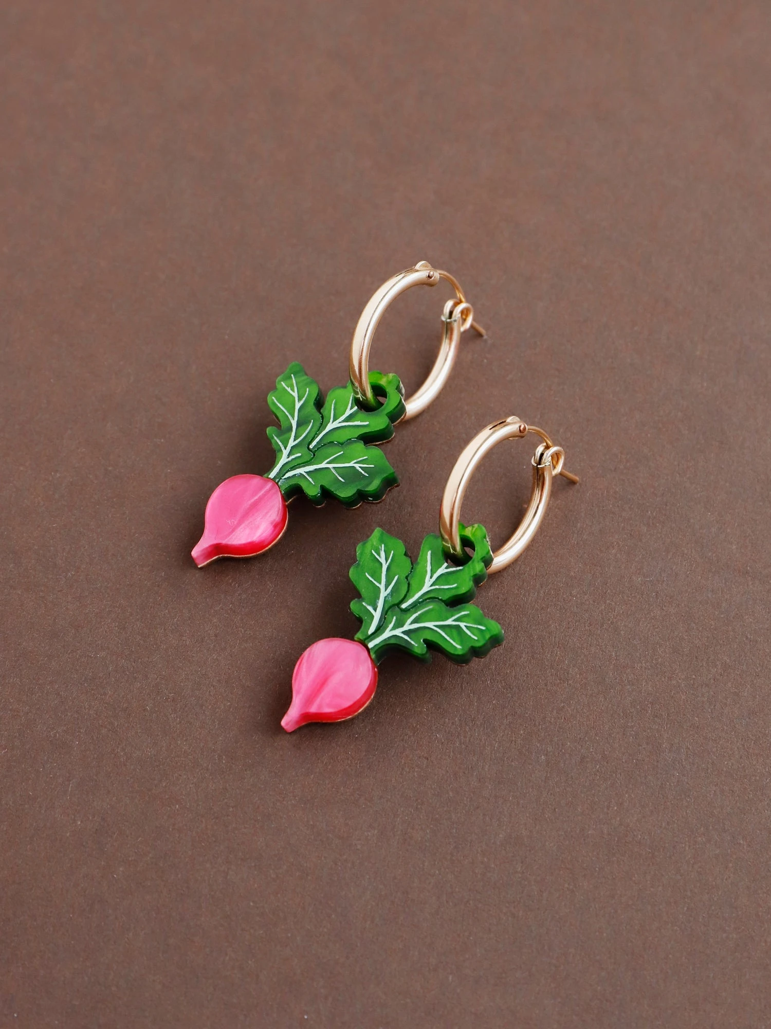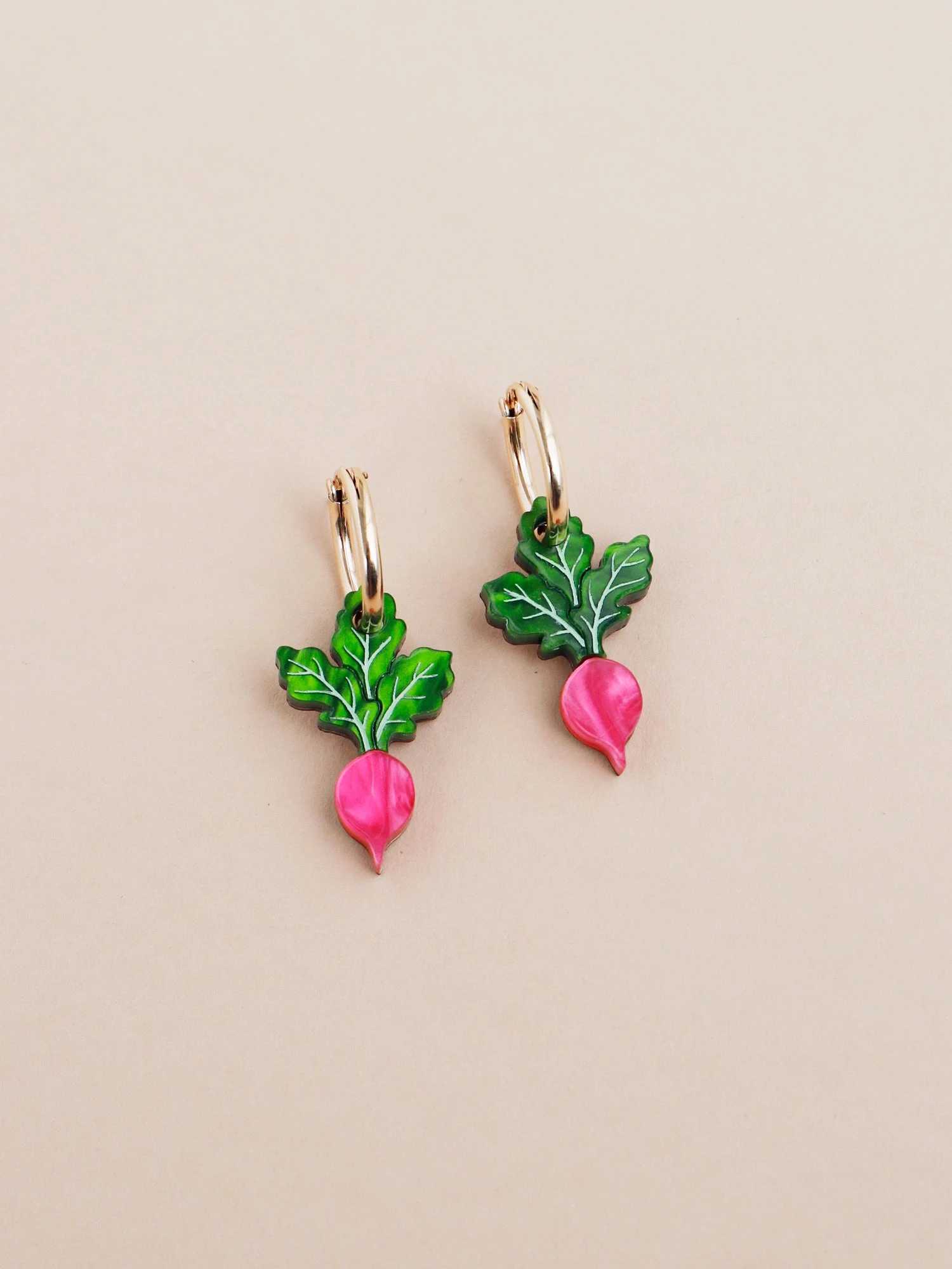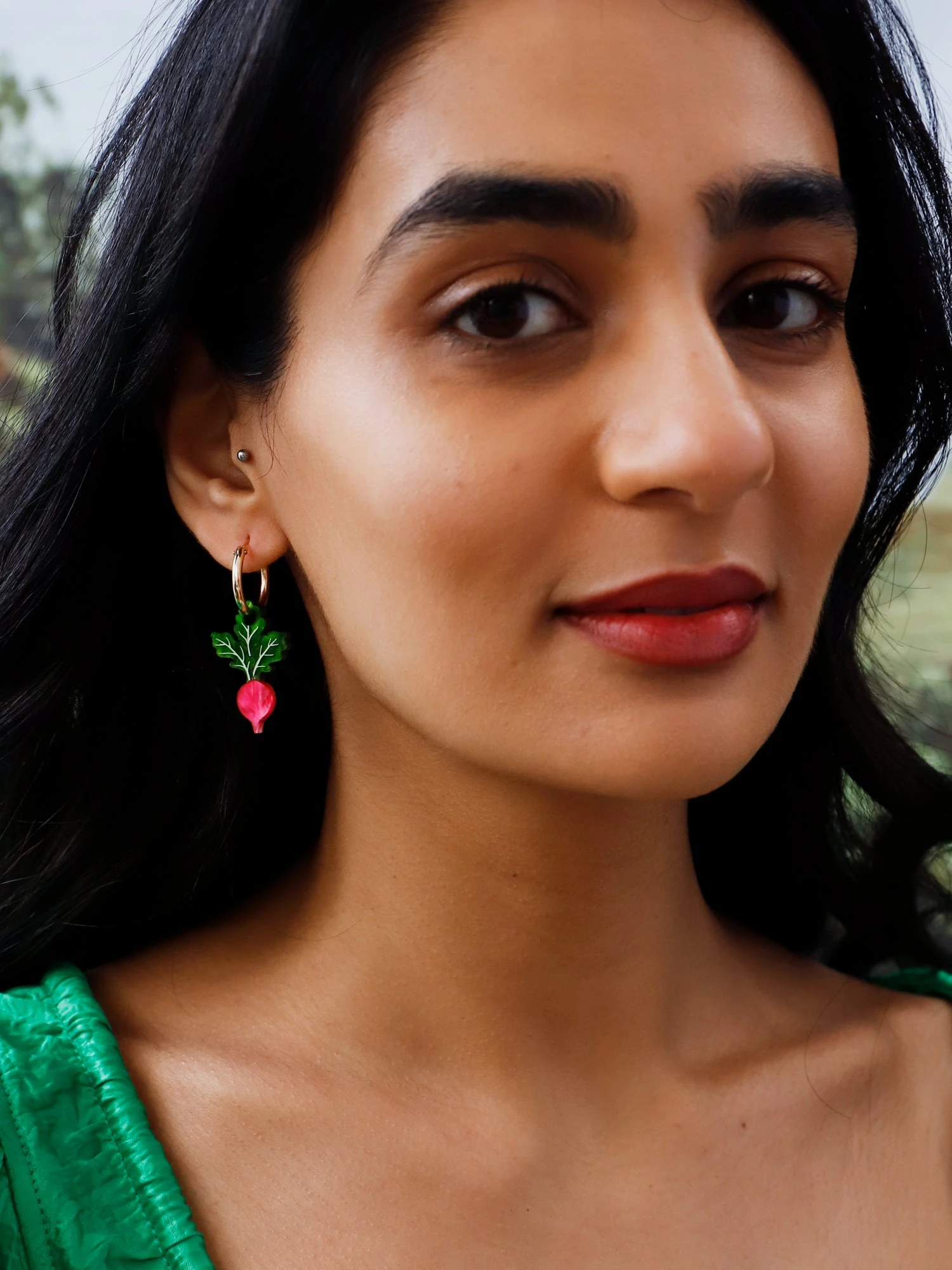 Our whimsical radish earrings are perfect for layering or mix ‘n’ match with our other garden hoops.Â