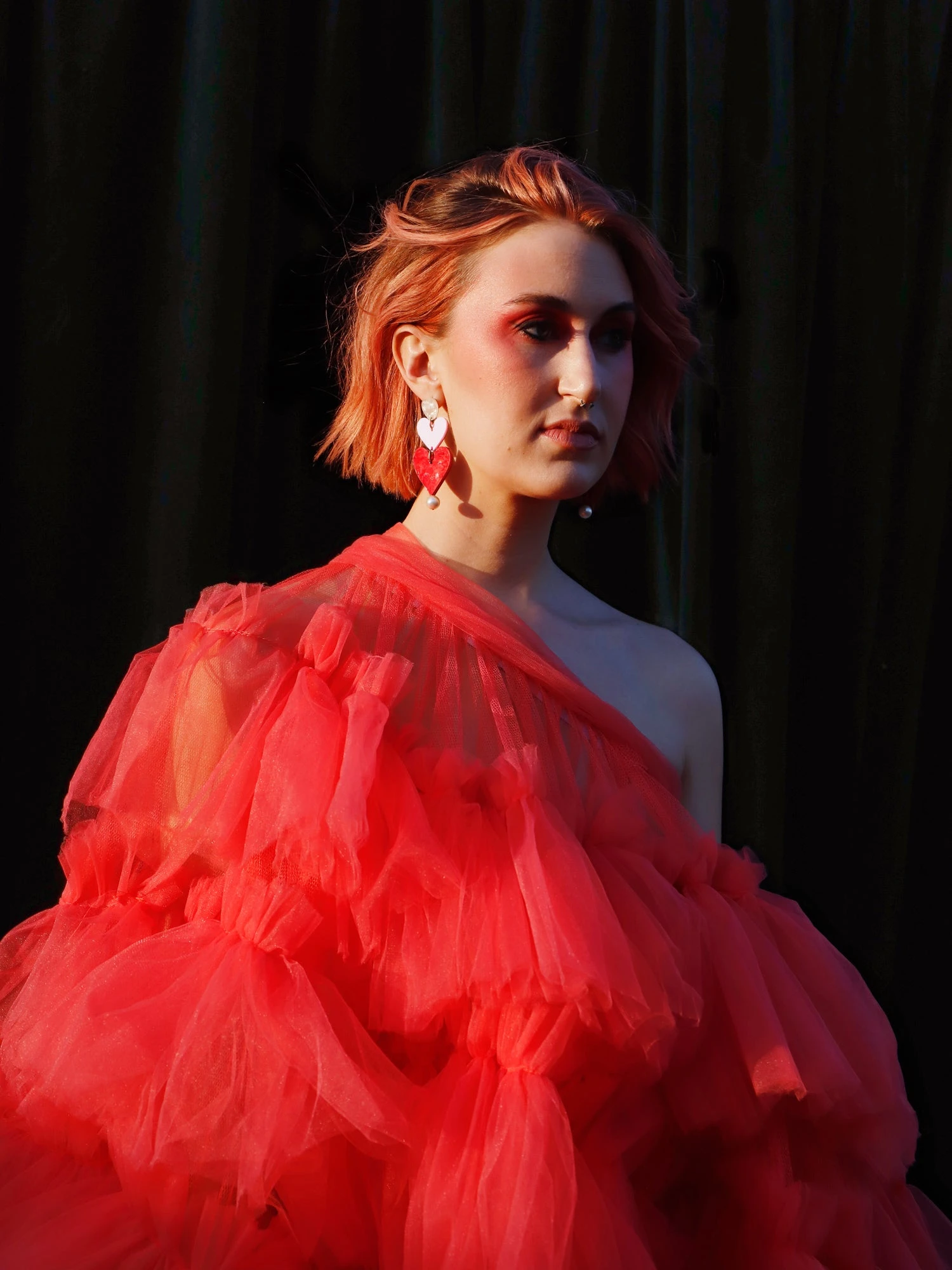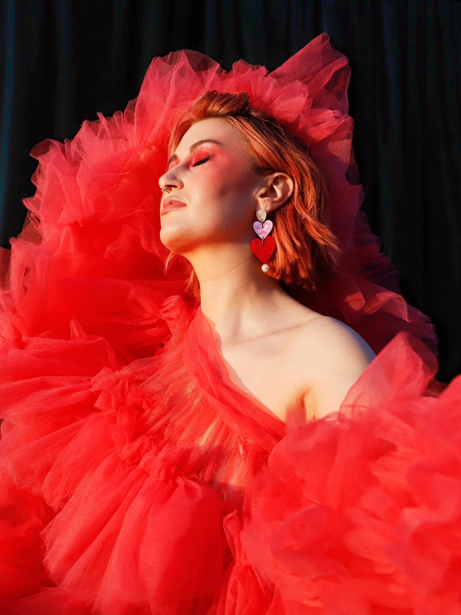 Earrings with gradient coloured heart pendants made from cream, pink and red marble acrylic and glass pearl beads.