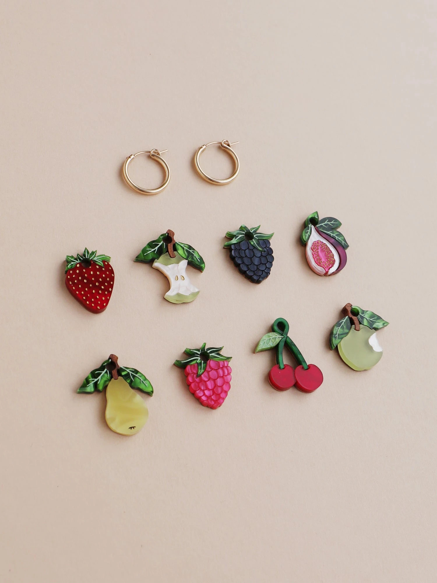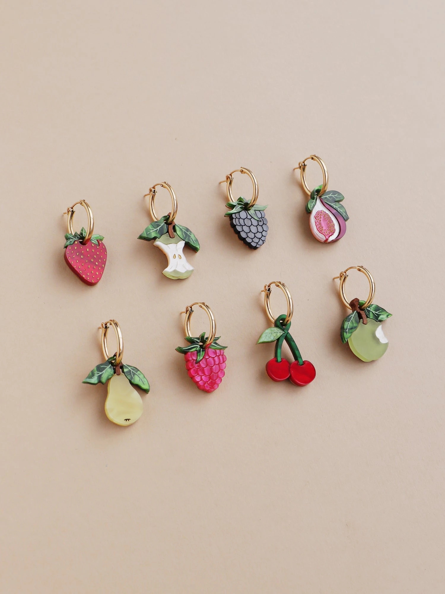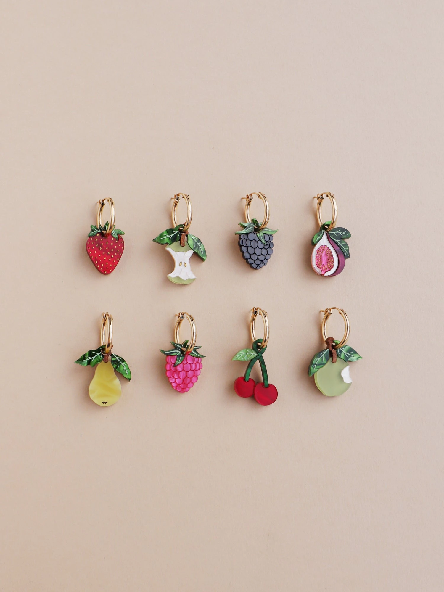 1x pear II charm, 1 x strawberry II charm , 1 x apple core charm , 1 x raspberry charm, 1 x cherry charm, 1 x blackberry charm, 1 x fig charm & 1 x apple bite charm.Â